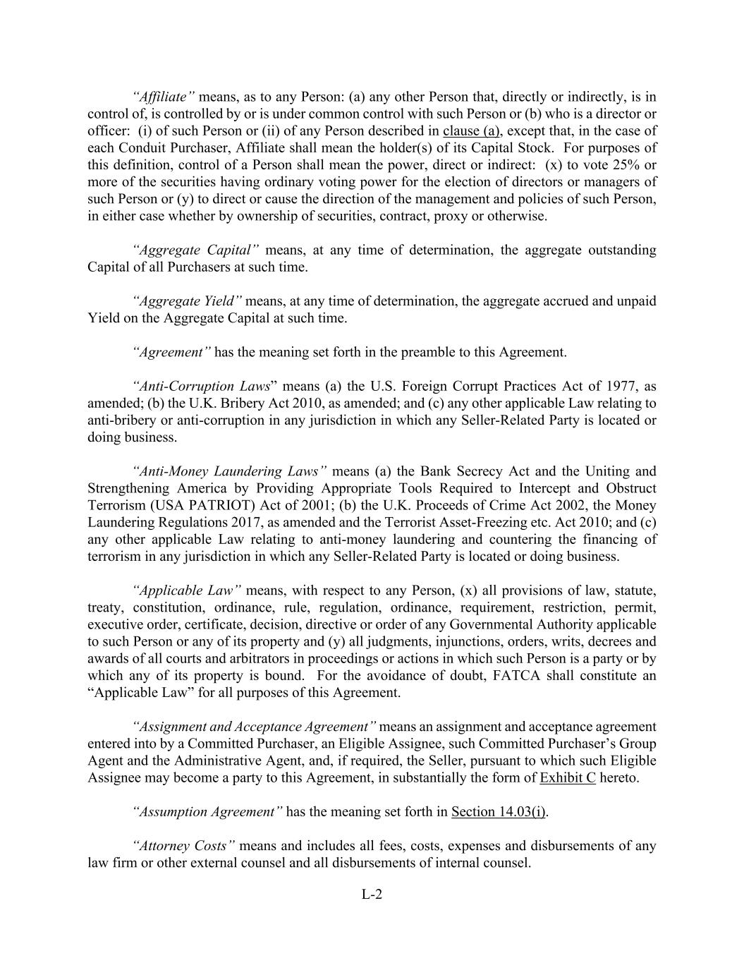 L-2“关联公司”是指,就任何人而言:(a)直接或间接受该人控制、受其控制或与其共同控制的任何其他人,或(b)作为董事或高级职员的任何其他人:(i)该人或(ii)条款(a)中所述的任何人,但就每个管道购买者而言,关联公司应指其股本的持有人。就本定义而言,对某人的控制是指直接或间接的权力:(x)为选举该人的董事或经理而投票的具有普通投票权的证券的25%或以上,或(y)指示或导致该人的管理层和政策的方向,在任一情况下,无论是通过证券所有权、合同、代理或其他方式。“总资本”是指,在任何确定时间,所有购买者在该时间的未偿资本总额。“总收益率”是指,在任何确定时间,总资本在该时间的累计应计和未付收益率。“协议”具有本协议序言部分规定的含义。“反腐败法”是指(a)经修订的1977年美国《反海外腐败法》;(b)经修订的2010年英国《反贿赂法》;(c)任何卖方关联方所在或开展业务的任何司法管辖区内与反贿赂或反腐败有关的任何其他适用法律。“反洗钱法”是指(a)2001年《银行保密法》和《通过提供拦截和阻止恐怖主义所需的适当工具来团结和加强美国(美国爱国者)法》;(b)2002年《英国犯罪所得法》、经修订的《2017年洗钱条例》和《恐怖主义资产冻结》等。2010年法;(c)在任何卖方关联方所在或开展业务的任何司法管辖区,与反洗钱和打击资助恐怖主义有关的任何其他适用法律。“适用法律”是指,就任何人而言,(x)适用于该人或其任何财产的法律、法规、条约、宪法、条例、规则、条例、条例、要求、限制、许可、行政命令、证书、决定、指令或任何政府当局的命令的所有规定,以及(y)所有法院和仲裁员在该人为当事人的诉讼或其任何财产受其约束的诉讼或诉讼中的所有判决、禁令、命令、令状、法令和裁决。为免生疑问,FATCA应构成本协议所有目的的“适用法律”。“转让和接受协议”是指由承诺的买方、合资格受让人、该承诺的买方的集团代理人和行政代理人以及(如有要求)卖方订立的转让和接受协议,据此,该等合资格受让人可成为本协议的一方,其实质形式为本协议的附件 C。“假设协议”具有第14.03(i)节中规定的含义。“律师费用”是指并包括任何律师事务所或其他外部法律顾问的所有费用、成本、开支和支出以及内部法律顾问的所有支出。
