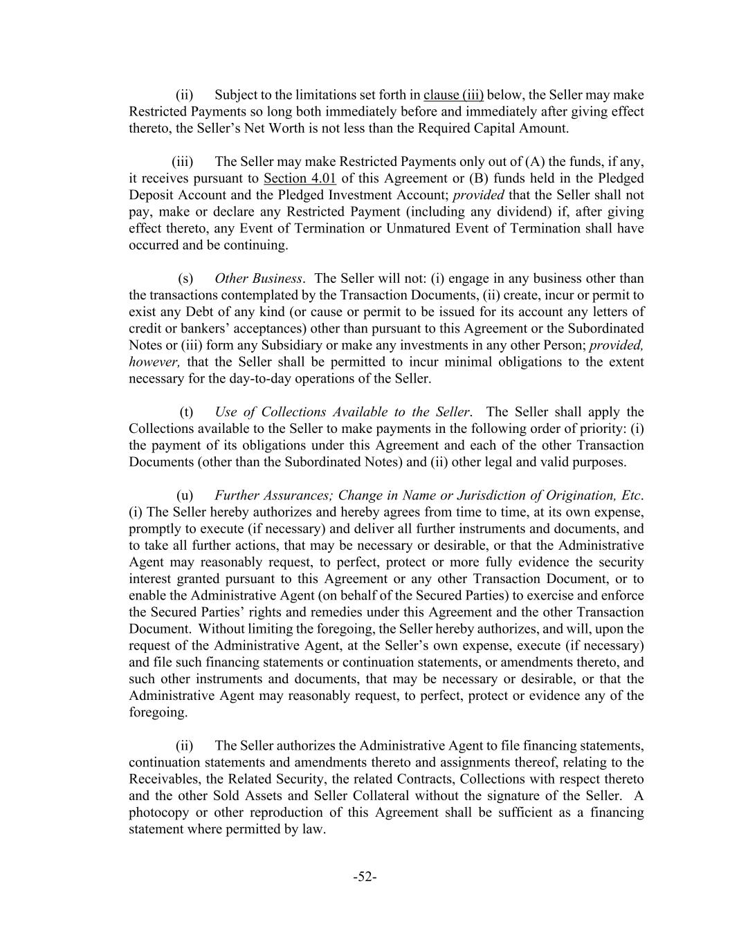 -52-(ii)在符合下文第(iii)款所述限制的情况下,卖方可以在紧接其生效之前和之后的很长时间内进行限制性付款,卖方的净值不低于所需的资本金额。(iii)卖方只能从(a)其根据本协议第4.01条收到的资金(如有)或(b)质押存款账户和质押投资账户中持有的资金中支付限制性付款;但卖方不得支付、支付或宣布任何限制性付款(包括任何股息),前提是在其生效后,任何终止事件或未到期的终止事件应已发生并仍在继续。(s)其他业务。卖方将不会:(i)从事交易文件所设想的交易以外的任何业务,(ii)创建、招致或允许存在任何种类的债务(或导致或允许为其账户签发任何信用证或银行承兑汇票),而不是根据本协议或次级票据,或(iii)组成任何子公司或对任何其他人进行任何投资;但卖方应被允许在卖方日常运营所需的范围内承担最低限度的义务。(t)使用卖方可用的藏品。卖方应按以下优先顺序应用卖方可获得的收款进行付款:(i)支付其在本协议和每一份其他交易文件(次级票据除外)下的义务,以及(ii)其他合法和有效的目的。(u)进一步保证;更改名称或起源管辖权等(i)卖方特此授权并特此同意不时自费迅速执行(如有必要)和交付所有进一步的文书和文件,并采取一切可能必要或可取的进一步行动,或行政代理人可能合理要求、完善、保护或更充分地证明根据本协议或任何其他交易文件授予的担保权益,或使行政代理人(代表有担保当事人)能够行使和强制执行有担保当事人在本协议和其他交易单证项下的权利和救济。在不限制前述内容的情况下,卖方特此授权并将根据行政代理人的请求,由卖方自费执行(如有必要)和归档此类融资报表或延续报表或其修订,以及可能必要或可取的,或行政代理人可能合理要求、完善、保护或证明上述任何内容的其他文书和文件。(二)卖方授权行政代理人提交与应收款、相关担保、相关合同、与此相关的收款以及其他出售资产和卖方抵押品有关的融资报表、延续报表及其修订及其转让,而无需卖方签字。在法律允许的情况下,本协议的影印件或其他复制品应足以作为融资报表。