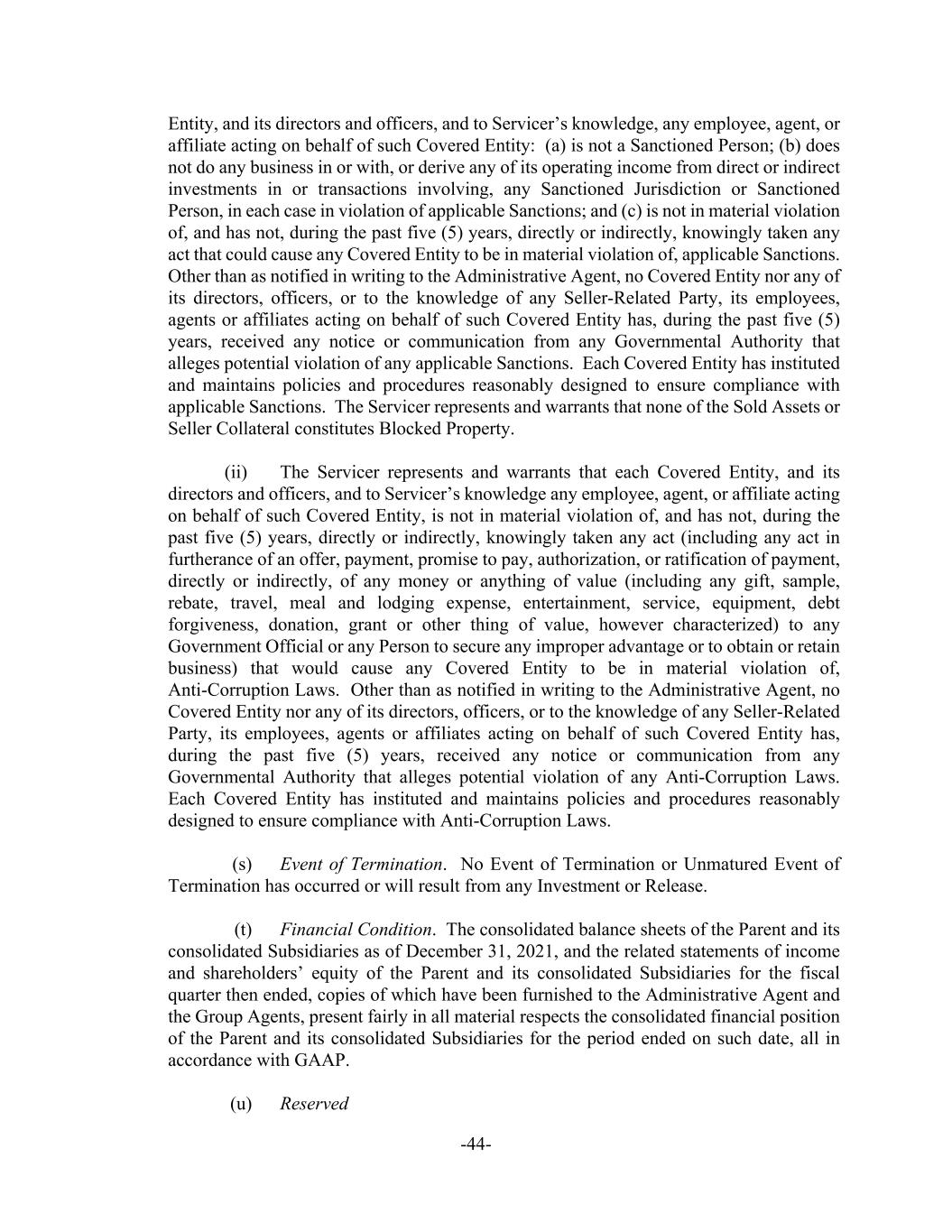-44-实体及其董事和高级管理人员,以及据Servicer所知,代表此类涵盖实体行事的任何雇员、代理人或关联公司:(a)不是受制裁的人;(b)不在任何受制裁的司法管辖区或受制裁的人中或与之开展业务,或从任何受制裁的司法管辖区或受制裁的人的直接或间接投资或涉及的交易中获得任何经营收入,在每种情况下均违反了适用的制裁;(c)在过去五(5)年中没有直接或间接严重违反,也没有,明知而采取的任何可能导致任何涵盖实体严重违反、适用制裁的行为。除以书面形式通知行政代理人外,在过去五(5)年内,没有任何涵盖实体或其任何董事、高级职员,或据任何卖方关联方、其雇员、代理人或代表该涵盖实体行事的关联公司所知,收到任何政府当局的任何通知或通信,声称可能违反任何适用的制裁。每个涵盖的实体都制定并维持合理设计的政策和程序,以确保遵守适用的制裁。服务商声明并保证,出售的资产或卖方抵押品均不构成被封锁的财产。(ii)服务商声明并保证,每个涵盖实体及其董事和高级管理人员,并据Servicer所知,代表该涵盖实体行事的任何雇员、代理人或关联公司没有重大违反,并且在过去五(5)年内没有直接或间接明知而采取任何行为(包括直接或间接促进任何金钱或任何有价值的东西(包括任何礼物、样品、回扣、差旅、膳食和住宿费用、娱乐、服务、设备、债务免除、捐赠,授予或其他有价值的东西,无论其特征如何)给任何政府官员或任何人,以获取任何不正当利益或获得或保留业务),这将导致任何涵盖的实体严重违反,反腐败法。除以书面形式通知行政代理人外,在过去五(5)年内,任何涵盖实体或其任何董事、高级职员,或据任何卖方关联方、其雇员、代理人或代表该涵盖实体行事的关联公司所知,均未收到任何政府当局的任何通知或通信,声称可能违反任何反腐败法律。每个涵盖的实体都制定并维护了合理设计的政策和程序,以确保遵守反腐败法律。(s)终止事件。任何投资或释放均未发生或将导致任何终止或未成熟的终止事件。(t)财务状况。截至2021年12月31日的母公司及其合并子公司的合并资产负债表,以及母公司及其合并子公司于该日终了财政季度的相关收益和股东权益报表,其副本已提供给行政代理人和集团代理人,在所有重大方面公允地反映了母公司及其合并子公司于该日终了期间的合并财务状况,均按照公认会计原则。(u)保留