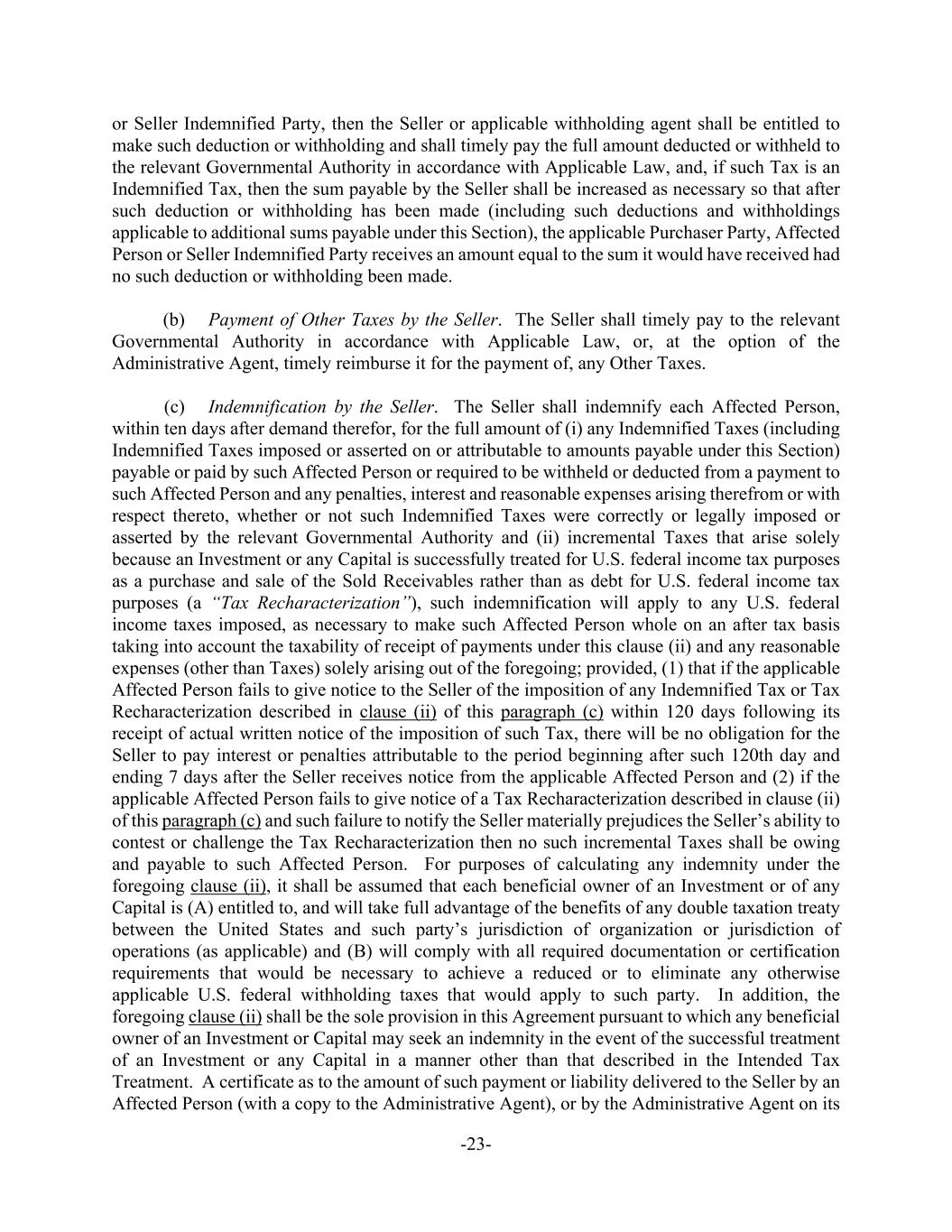 -23-或卖方受偿方,则卖方或适用的扣缴义务人有权进行此类扣除或代扣,并应按照适用法律及时将扣除或代扣的全部金额支付给相关政府部门,而如果此类税款为补偿税款,则应视需要增加卖方应支付的金额,以便在进行此类扣除或代扣后(包括适用于根据本条应支付的额外款项的此类扣除和代扣),适用的买方,受影响的人或卖方受赔偿方收到的金额等于如果没有进行此类扣除或预扣,它本应收到的金额。(b)卖方支付其他税款。卖方应根据适用法律及时向相关政府主管部门缴纳,或由行政代理人选择及时偿还其缴纳的任何其他税款。(c)卖方的赔偿。卖方须在要求赔偿后十天内,向每名受影响人士赔偿(i)该受影响人士应付或已支付或须扣留或扣除的任何受补偿税款(包括就根据本条须支付的款项征收或主张征收或可归因于该款项的受补偿税款)的全部金额,以及由此或与此有关的任何罚款、利息及合理开支,无论有关政府当局是否正确或合法地征收或主张此类赔偿税款,以及(ii)仅因一项投资或任何资本在美国联邦所得税目的上成功地被视为购买和出售已售应收账款而不是作为美国联邦所得税目的的债务(“税务重新定性”)而产生的增量税款,此类赔偿将适用于征收的任何美国联邦所得税,视需要使该受影响人在税后基础上完整,同时考虑到收到根据本条款(ii)项下的付款的可课税性以及仅因上述情况而产生的任何合理费用(税项除外);但(1)如适用的受影响人未能在收到征收该等税款的实际书面通知后120天内向卖方发出征收本款(c)项第(ii)项所述任何弥偿税款或税务重新定性的通知,卖方将没有义务支付自该第120天后开始至卖方收到适用的受影响人的通知后7天结束的期间的利息或罚款,以及(2)如果适用的受影响人未能就本款(c)款第(ii)款所述的税务重新定性发出通知,并且这种未能通知卖方对税务重新定性提出异议或质疑的能力造成重大损害,则不应向该受影响人欠缴和应付此类增量税款。为计算上述第(ii)条下的任何赔偿,应假定投资或任何资本的每个受益所有人(a)有权并将充分利用美国与该方的组织管辖权或经营管辖权(如适用)之间的任何双重征税条约的好处,并且(b)将遵守所有必要的文件或证明要求,这将是实现减少或消除适用于该方的任何其他适用的美国联邦预扣税所必需的。此外,上述第(ii)条应是本协议中的唯一条款,据此,在以非预期税务处理中所述的方式成功处理投资或任何资本的情况下,投资或资本的任何实益拥有人可寻求赔偿。受影响人士向卖方交付的有关该等付款或赔偿责任的金额的证明(连同一份副本交给行政代理人),或由行政代理人在其