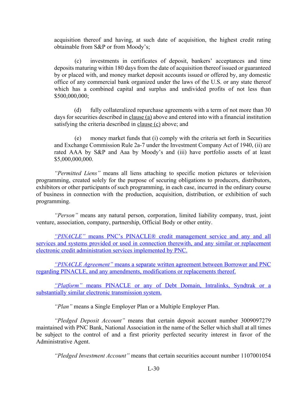 L-30的取得,并在该取得日具有可从标普或穆迪获得的最高信用评级;(c)对存单、银行承兑汇票和定期存款的投资,这些存单、承兑汇票和定期存款在取得之日起180天内由其发行或担保或配售,以及由其发行或发售的货币市场存款账户,根据美国或其任何州的法律组建的任何商业银行的任何国内办事处,其资本和盈余及未分利润合计不少于500,000,000美元;(d)就上文(a)条所述的证券与满足上文(c)条所述标准的金融机构订立的期限不超过30天的完全抵押回购协议;(e)符合《1940年投资公司法》证券交易委员会第2a-7条规定的标准的货币市场基金,(ii)获标普 AAA评级及穆迪AA评级,且(iii)的投资组合资产至少为5,000,000,000美元。“许可留置权”是指附加于特定电影或电视节目的所有留置权,仅为确保对此类节目的制作者、分销商、参展商或其他参与者的义务而创建,在每种情况下,在与此类节目的制作、获取、发行或展览相关的正常业务过程中产生。“人”是指任何自然人、公司、有限责任公司、信托、合资、协会、公司、合伙企业、官方机构或其他实体。“钉子户”是指PNC的钉子户®信用管理服务以及与此相关的任何和所有提供或使用的服务和系统,以及由PNC实施的任何类似或替代的电子信用管理服务。“PINACLE协议”是指借款人与PNC就PINACLE及其任何修订、修改或替换达成的单独书面协议。“平台”是指PINACLE或任何债务域、Intralinks、Syndtrak或基本相似的电子传输系统。“计划”是指单一雇主计划或多个雇主计划。“质押存款账户”是指以卖方名义在PNC银行、National Association维持的、在任何时候都应受制于行政代理人的控制和优先完善的、有利于行政代理人的担保权益的某一存款账号3009097279。“质押投资账户”是指某证券账户号1107001054