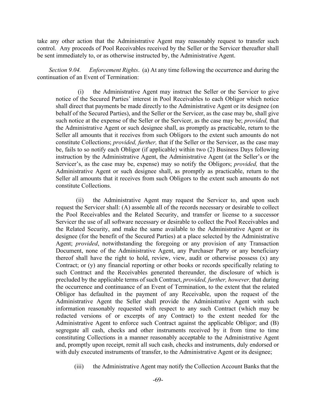 -69-采取行政代理人可能合理要求的任何其他行动以转移此类控制权。卖方或服务商此后收到的任何集合应收款收益应立即发送给行政代理人,或由行政代理人另有指示。第9.04节。强制执行权。(a)在终止事件发生后的任何时间和终止事件持续期间:(i)行政代理人可指示卖方或服务商向每一债务人发出关于有担保当事人在集合应收款中的权益的通知,该通知应指示直接向行政代理人或其指定人(代表有担保当事人)付款,而卖方或服务商(视情况而定)应发出该通知,费用由卖方或服务商(视情况而定)承担;但,行政代理人或该等指定人应在切实可行范围内尽快将其从该等义务人收到的所有款项退还卖方,但该等款项不构成收款;此外,如果卖方或服务人(视情况而定)未在行政代理人发出指示后的两(2)个营业日内通知各义务人(如适用),则行政代理人(由卖方或服务人(视情况而定,费用由其承担)可如此通知义务人;但行政代理人或该等指定人应在切实可行范围内尽快,将其从这些义务人收到的所有金额退还给卖方,前提是这些金额不构成收款。(ii)行政代理人可要求服务人,而应该要求,服务人应:(a)汇集收集集合应收款和相关担保所必需或可取的所有记录,并将收集集合应收款和相关担保所必需或可取的所有软件的使用转让或许可给继任服务人,并在行政代理人选定的地点向行政代理人或其指定人(为担保当事人的利益)提供这些软件;但尽管有上述规定或任何交易文件的任何规定,行政代理人、任何买方一方或其任何受益人均无权持有、审查、查看、审计或以其他方式拥有(x)任何合同;或(y)任何财务报告或其他账簿或记录,具体涉及该合同及其项下产生的应收款项,但该合同的适用条款不排除披露这些账簿或记录,但进一步规定,在终止事件发生和持续期间,在相关债务人拖欠任何应收款项的情况下,应行政代理人的请求,卖方应在行政代理人对适用的债务人强制执行该合同所需的范围内,向行政代理人提供合理要求的与任何该等合同有关的信息(可能是任何合同的编辑版本或节选);(b)以行政代理人合理接受的方式将其不时收到的构成托收的所有现金、支票和其他票据分开,并在收到后立即汇出所有该等现金、支票和票据、妥为背书或妥为签立的转账文书,向行政代理人或其指定人;(iii)行政代理人可以通知收款账户银行,该