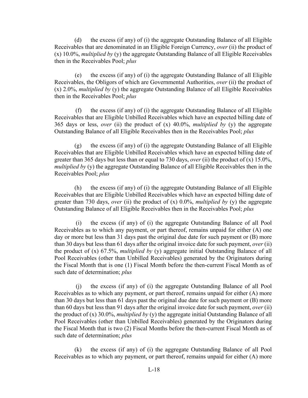 L-18(d)(i)以合格外币计价的所有合格应收款的未偿余额总额超过(ii)(x)10.0%的乘积的部分(如有),乘以(y)当时在应收款池中的所有合格应收款的未偿余额总额;加上(e)(i)所有合格应收款的未偿余额总额(其债务人为政府当局)超过(ii)(x)2.0%的乘积的部分(如有),乘以(y)应收款池中当时所有符合条件的应收款项的未清余额总额;加上(f)(i)所有符合条件的应收款项的未清余额总额(如有)超过(ii)(x)40.0%的乘积(如有)的部分(如有),乘以(y)应收款池中所有符合条件的应收账款的未偿余额总额;加上(g)(i)所有符合条件的应收账款的未偿余额总额(如果有的话),即预期账单日大于365天但小于或等于730天的符合条件的未开票应收款,超过(ii)(x)15.0%的乘积,乘以(y)应收款池中当时所有符合条件的应收账款的未偿余额总额;加上(h)(i)所有符合条件的应收账款的未偿余额总额(如有)超过(ii)(x)0.0%的乘积,再乘以(y)应收款池中当时所有符合条件的应收账款的未偿余额总额;加上(i)任何付款或其部分所针对的所有池应收账款的未偿余额总额(如有)的超出部分(如有),(a)该等付款的原到期日期后一天或一天以上但少于31天,或(b)该等付款的原发票日期后30天以上但少于61天,超过(x)67.5%的乘积,仍未付款,乘以(y)发起人在截至该确定日期的当前财政月之前的一个(1)财政月内产生的所有集合应收账款(未开票应收账款除外)的初始未偿余额总额;加上(j)(i)所有集合应收账款的未偿余额总额的超出部分(如有),任何付款或其中的一部分,(a)该等付款的原到期日期后超过30天但少于61天或(b)该等付款的原发票日期后超过60天但少于91天,超过(ii)(x)30.0%的乘积,乘以(y)发起人在截至该确定日期的当前财政月之前的两(2)个财政月内产生的所有集合应收账款(未开票应收账款除外)的初始未偿余额总额;加上(k)(i)所有集合应收账款的未偿余额总额的超出部分(如果有的话),其中任何一项付款或部分仍未支付(a)更多