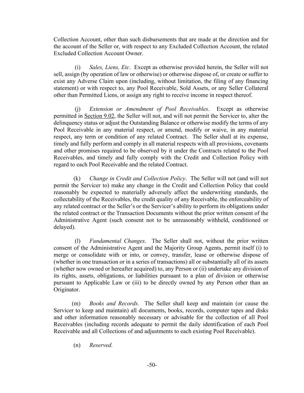 -50-收款账户,但根据指示并为卖方或就任何除外收款账户而言相关的除外收款账户所有者的账户进行的付款除外。(i)销售、留置权等。除本文另有规定外,卖方不会出售、转让(通过法律运作或其他方式)或以其他方式处分,或因(包括但不限于提交任何融资报表)或就任何集合应收款、已售资产或除许可留置权之外的任何卖方抵押品而产生或遭受任何不利债权,或转让任何收取与此相关的收益的权利。(j)延长或修正集合应收款。除第9.02节另有许可外,卖方不会、也不会允许服务商在任何重大方面改变拖欠状态或调整未清余额或以其他方式修改任何应收款项池的条款,或在任何重大方面修改、修改或放弃任何相关合同的任何条款或条件。卖方应自费、及时、全面履行并在所有重大方面遵守其在与集合应收款有关的合同项下要求遵守的所有条款、契诺和其他承诺,并及时、全面遵守与每个集合应收款和相关合同有关的信用和收款政策。(k)信贷和催收政策的变化。卖方不会(也不会允许服务商)对信贷和收款政策作出任何可以合理预期会对承保标准、应收款的可收回性、任何应收款的信用质量、任何相关合同的可执行性或卖方或服务商履行其在相关合同或交易文件下的义务的能力产生重大不利影响的变更,而无需事先征得行政代理人的书面同意(此种同意不得被无理拒绝、附加条件或延迟)。(l)根本性变化。未经行政代理人和多数群体代理人事先书面同意,卖方不得允许自己(i)将其全部或基本全部资产(无论是在一次交易中还是在一系列交易中)与任何人合并或合并,或向任何人转让、转让、出租或以其他方式处置(无论是现在拥有或以后获得的),或(ii)根据分割计划或根据适用法律以其他方式对其权利、资产、义务或负债进行任何分割,或(iii)由发起人以外的任何人直接拥有。(m)账簿和记录。卖方应保存和维护(或促使服务商保存和维护)所有文件、簿册、记录、计算机磁带和磁盘以及收取所有集合应收款合理必要或可取的其他信息(包括足以允许每日识别每个集合应收款的记录以及对每个现有集合应收款的所有收取和调整)。(n)保留。