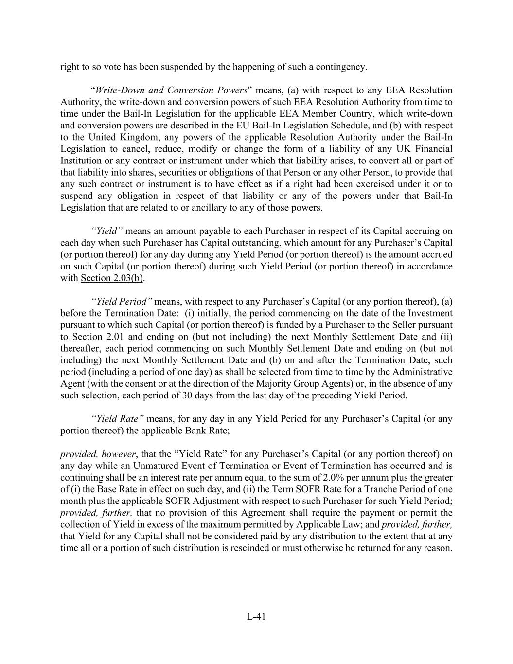 L-41的投票权因发生这样的突发事件而被暂停。“减记和转换权力”是指,(a)就任何EEA解决机构而言,此类EEA解决机构根据适用的EEA成员国的保释立法不时拥有的减记和转换权力,这些减记和转换权力在欧盟保释立法附表中有所描述,以及(b)就英国而言,根据保释立法,适用的解决机构有权取消、减少、修改或改变任何英国金融机构的负债形式或产生该负债的任何合同或文书,将该责任的全部或部分转换为该人或任何其他人的股份、证券或义务,规定任何该等合约或文书的效力犹如已根据该合约或文书行使一项权利一样,或中止与该责任有关的任何义务或与任何该等权力相关或附属的该保释立法下的任何权力。“收益率”是指当每一买方有未偿资本时,就其每天应计资本应付给每一买方的金额,该金额对于任何买方在任何收益期(或其部分)的任何一天的资本(或其部分)而言,是根据第2.03(b)节在该收益期(或其部分)应计资本(或其部分)的金额。“收益期”是指,就任何买方的资本(或其任何部分)而言,(a)在终止日期之前:(i)最初,自买方根据第2.01条向卖方提供该等资本(或其部分)所依据的投资日期开始并于(但不包括)下一个月结算日期结束的期间,以及(ii)此后,自该月结算日期开始并于(但不包括)下一个月结算日期结束的每一期间,以及(b)在终止日期及之后,由行政代理人(经同意或在多数群体代理人的指示下)不时选定的期间(包括一天的期间),或在没有任何此类选择的情况下,自上一个收益期的最后一天起每30天的期间。“收益率”是指,在任何买方资本(或其任何部分)的任何收益期内的任何一天,适用的银行利率;但条件是,在未到期的终止事件或终止事件已经发生并正在持续的任何一天,任何买方资本(或其任何部分)的“收益率”应为年利率等于每年2.0%的总和加上(i)在该日有效的基准利率中的较高者,(ii)为期一个月的分割期的定期SOFR利率加上该买方在该收益期的适用SOFR调整;此外,本协议的任何条款均不得要求支付或允许收取超过适用法律允许的最高收益;此外,条件是,任何资本的收益不得被视为通过任何分配支付,只要在任何时候该分配的全部或部分已被撤销或必须以其他方式因任何理由而被退回。