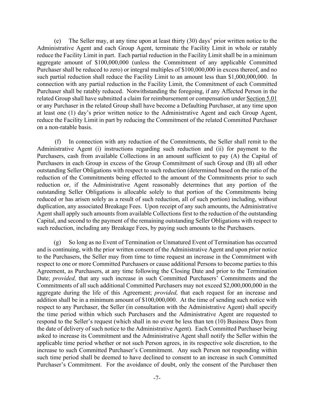 -7-(e)卖方可随时在至少提前三十(30)天书面通知行政代理人和每个集团代理人后,全部终止融资限额或按比例部分减少融资限额。融资限额的每一部分削减,最低总额应为100,000,000美元(除非任何适用的承诺买方的承诺应减至零)或超过100,000,000美元的整数倍,且任何此类部分削减均不得将融资限额减至低于1,000,000,000美元的数额。对于融资限额的任何部分减少,每个承诺的买方的承诺应按比例减少。尽管有上述规定,如果相关集团中的任何受影响人应已根据第5.01条提出补偿或赔偿要求,或相关集团中的任何买方应已成为违约买方,则在至少提前一(1)天向行政代理人和每个集团代理人发出书面通知后的任何时间,通过在不可评定的基础上减少相关承诺买方的承诺来部分减少融资限额。(f)就任何削减承诺而言,卖方应向行政代理人汇出(i)有关削减的指示和(ii)向买方付款、从可用收款中获得的现金,其数额足以支付(a)买方在每个集团的资本超过该集团的集团承诺,以及(b)与此种削减有关的所有其他未偿还卖方义务(根据削减承诺与此种削减前的承诺数额的比率确定),如果行政代理人合理地确定,未偿卖方义务的任何部分仅可分配给正在减少的该部分承诺或仅因此类减少而产生的该部分承诺,则所有该部分)包括但不重复任何相关的破碎费。在收到任何此类金额后,行政代理人应将可用收款中的此类金额首先用于减少未偿资本,其次通过向买方支付此类金额来支付与此类减少有关的剩余未偿卖方义务,包括任何破损费。(g)只要没有发生终止事件或未成熟的终止事件,且仍在继续,经行政代理人事先书面同意并在事先通知买方后,卖方可在截止日期之后和终止日期之前的任何时间,不时要求增加对一名或多名承诺买方的承诺,或促使更多人成为本协议的当事人,作为买方;但,在本协议有效期内,此类承诺采购人承诺的任何此类增加以及所有此类额外承诺采购人的承诺总额不得超过2000,000,000美元;条件是,每项增加和增加的请求的最低金额应为100,000,000美元。在就任何买方发送此种通知时,卖方(与行政代理人协商)应指明要求该等买方和行政代理人对卖方请求作出答复的时间期限(在任何情况下不得少于自该通知送达行政代理人之日起十(10)个工作日)。被要求增加其承诺的每个承诺买方和行政代理人应在适用的时间段内通知卖方,无论该人是否自行决定同意增加该承诺买方的承诺。任何此类人员未在该时间段内作出回应,应被视为拒绝同意增加该承诺买方的承诺。为免生疑问,只有买方同意后