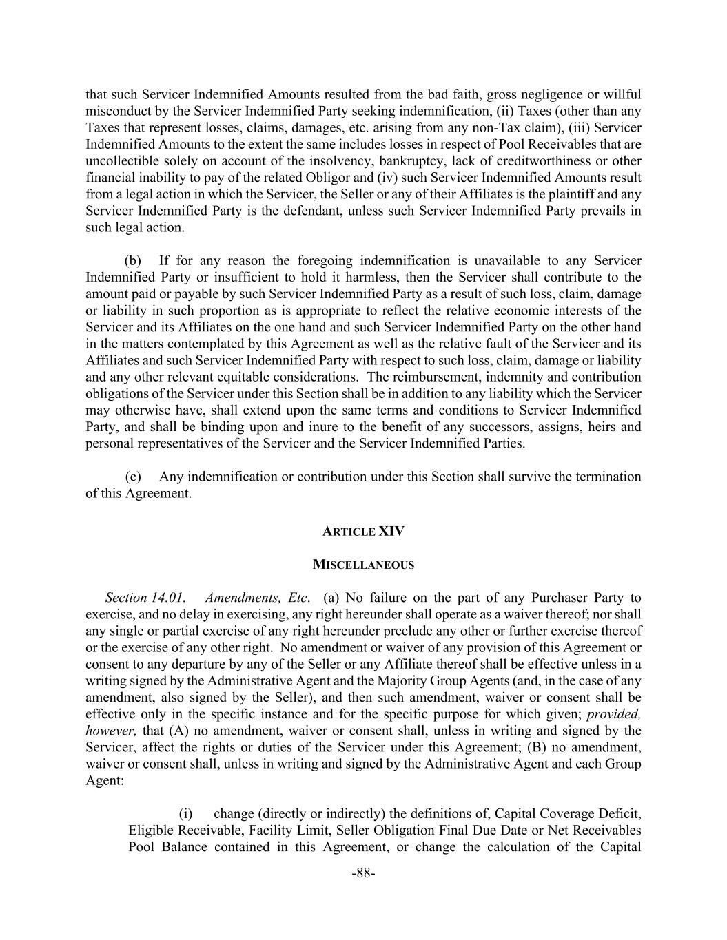 -88-此类服务商赔偿金额是由于寻求赔偿的服务商赔偿方的恶意、重大过失或故意不当行为造成的,(ii)税款(代表任何非税务索赔产生的损失、索赔、损害等的任何税款除外),(iii)服务商赔偿金额,但以相同金额为限,包括仅因相关义务人无力偿债、破产、缺乏信誉或其他财务无力支付而无法收回的集合应收账款方面的损失,以及(iv)此类服务商赔偿金额是由服务商提起的法律诉讼导致的,卖方或其任何关联公司为原告,任何服务商受偿方为被告,除非该服务商受偿方在该法律诉讼中胜诉。(b)如因任何理由,任何服务人受偿方无法获得上述赔偿或不足以使其免受损害,则服务人须就该服务人受偿方因该等损失、申索而支付或应付的款额作出贡献,损害或赔偿责任的适当比例,以反映在本协议所设想的事项中,服务人及其附属公司和该服务人受赔方的相对经济利益,以及服务人及其附属公司和该服务人受赔方在该损失、索赔、损害或赔偿责任以及任何其他相关衡平法考虑方面的相对过错。服务人根据本条所承担的偿还、赔偿及分担责任,除服务人可能另有承担的任何法律责任外,亦须按相同条款及条件延伸至服务人获弥偿方,并对服务人及服务人获弥偿方的任何继承人、受让人、继承人及遗产代理人具有约束力,并对其有利。(c)根据本条作出的任何赔偿或分担,在本协议终止后仍然有效。第十四条杂项第14.01节。修订等(a)任何买方一方没有未行使,也没有延迟行使,本协议项下的任何权利均应作为对其的放弃而运作;也不应因任何单一或部分行使本协议项下的任何权利而排除任何其他或进一步行使或任何其他权利的行使。任何卖方或其任何关联公司对本协议任何条款的任何修改或放弃或对任何离开的同意均不具有效力,除非以书面形式由行政代理人和多数群体代理人签署(并且,在任何修改的情况下,也由卖方签署),然后该修改、放弃或同意仅在特定情况下和为所给出的特定目的有效;但是,前提是(a)任何修改、放弃或同意均不得,除非以书面形式并由服务人签署,影响服务商在本协议下的权利或义务;(b)除非以书面形式并经行政代理人和各集团代理人签署,否则不得修改、放弃或同意:(i)更改(直接或间接)本协议中所载的、资本覆盖赤字、合格应收账款、融资限额、卖方债务最终到期日或应收账款净额池余额的定义,或更改资本的计算