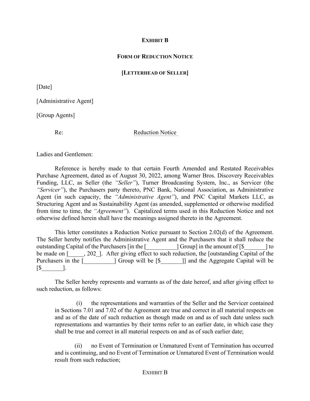 展览B展览B表格的减少通知[卖方抬头] [日期] [行政代理人] [集团代理人]回复:减少通知女士们先生们:特此提及Warner Bros. Discovery Receivables Funding,LLC作为卖方(“卖方”)、Turner Broadcasting System,Inc.作为服务商(“服务商”)、买方一方、PNC银行、National Association作为行政代理人(在此身份下称为“行政代理人”)、以及PNC Capital Markets LLC作为结构代理和可持续发展代理(经修订,不时补充或以其他方式修改,“协议”)。本减持通知中使用且未在此另行定义的大写术语应具有协议中赋予的含义。根据协议第2.02(d)节,本函构成减持通知。卖方特此通知行政代理人和买方,其应于[ __________ ]集团]减少买方的未偿资本,金额为[ $ _________ ],将于[ ______,202 _ ]进行。减持生效后,[ __________ ]集团中买方的[未偿资本将为[ $ ______ ] ],总资本将为[ $ ______ ]。卖方特此声明和保证截至本协议日期,并在实施该等减持后,如下:(i)协议第7.01和7.02条所载卖方和服务商的陈述和保证在所有重大方面都是真实和正确的,如同在该日期和截至该日期作出的一样,除非该等陈述和保证的条款所指的是较早的日期,在这种情况下,它们应在该较早日期和截至该日期的所有重大方面是真实和正确的;(ii)没有发生任何终止事件或未成熟的终止事件并正在继续,并且不会因该等减少而导致任何终止事件或未成熟的终止事件;