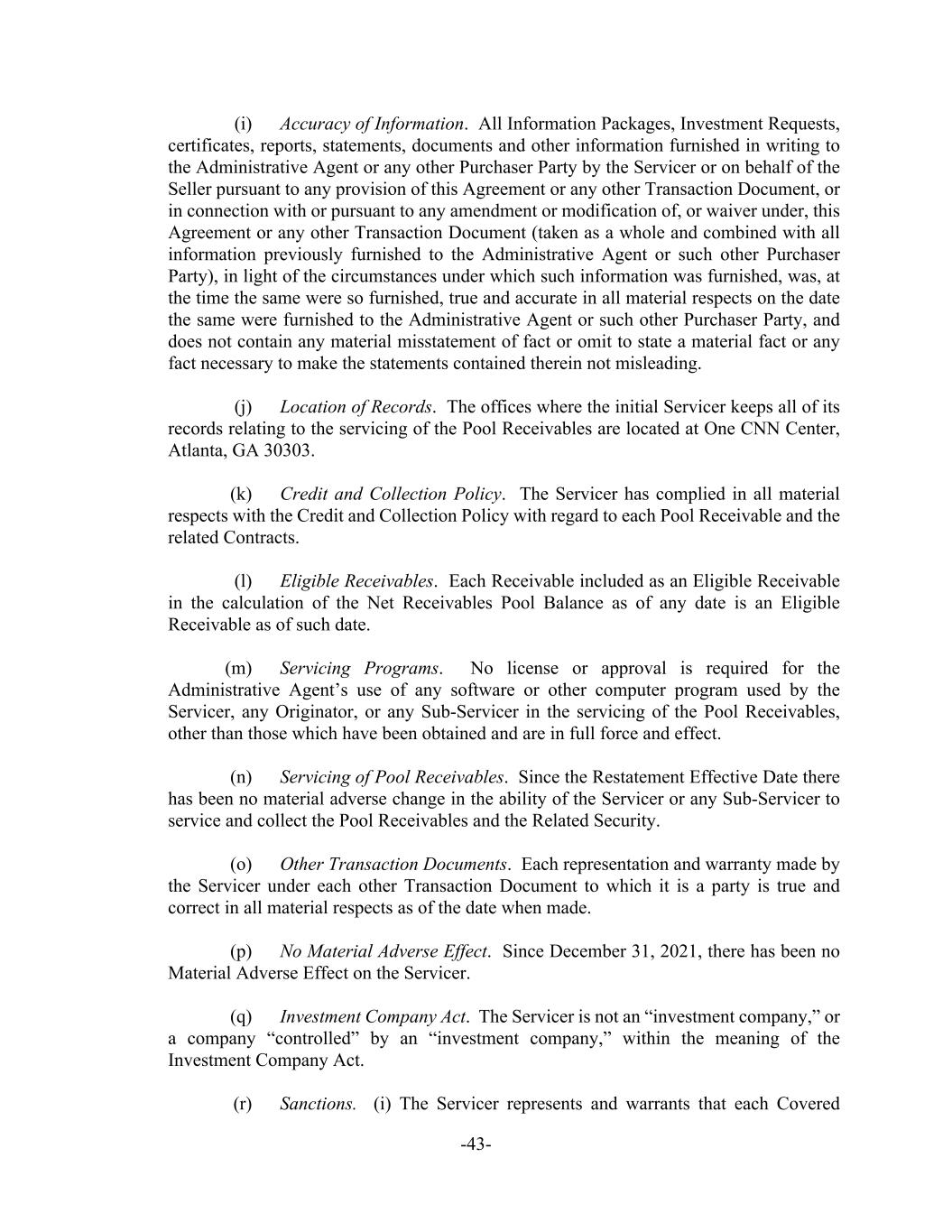 -43-(i)信息的准确性。根据本协议或任何其他交易文件的任何规定,或与本协议或任何其他交易文件的任何修改、修改或根据本协议或任何其他交易文件(作为一个整体并结合先前提供给行政代理人或此类其他买方)的所有信息包、投资请求、证书、报告、报表、文件和其他信息以书面形式提供给行政代理人或任何其他买方一方,根据提供此类信息的情况,在向行政代理人或该等其他买方提供该等资料之日,该等资料在所有重大方面均属真实及准确,并不包含任何重大的事实错报或遗漏陈述重要的事实或任何必要的事实,以使其中所载的陈述不具误导性。(j)记录的位置。初始服务商保存与池应收账款服务有关的所有记录的办公室位于One CNN Center,Atlanta,GA 30303。(k)信贷和催收政策。服务商已在所有重大方面遵守关于每个池应收款项和相关合同的信用和收款政策。(l)符合条件的应收款。在计算截至任何日期的应收账款净额池余额时作为合格应收账款列入的每项应收账款均为截至该日期的合格应收账款。(m)服务方案。行政代理人使用服务人、任何发起人、任何次级服务人在池应收款服务中使用的任何软件或其他计算机程序,除已取得并具有完全效力和效力的软件或程序外,无需使用许可或批准。(n)池应收款的服务。自重述生效日期以来,服务商或任何次级服务商服务和收取集合应收账款及相关担保的能力并无重大不利变化。(o)其他交易文件。服务商根据其作为一方当事人的相互交易文件作出的每一项陈述和保证,在作出之日的所有重大方面都是真实和正确的。(p)无实质性不利影响。自2021年12月31日以来,未对服务商产生重大不利影响。(q)《投资公司法》。服务商不是《投资公司法》意义上的“投资公司”,也不是“投资公司”“控制”的公司。(r)制裁。(i)服务人声明并保证每项涵盖