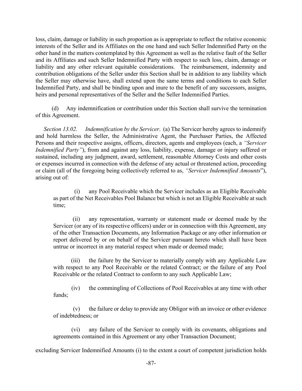 -87-损失、索赔、损害或赔偿责任的适当比例,以反映卖方及其关联公司和该卖方受赔偿方在本协议所设想的事项中的相对经济利益以及卖方及其关联公司和该卖方受赔偿方在该损失、索赔、损害或赔偿责任以及任何其他相关衡平法考虑方面的相对过错。卖方根据本条承担的偿还、赔偿和分摊义务应是卖方可能承担的任何责任的补充,应以相同的条款和条件延伸至每一卖方受赔偿方,并对卖方和卖方受赔偿方的任何继承人、受让人、继承人和个人代表具有约束力并符合其利益。(d)根据本条作出的任何赔偿或分担,在本协议终止后仍然有效。第13.02节。服务商的赔偿。(a)服务商特此同意对卖方、行政代理人、买方各方、受影响人士及其各自的受让人、高级职员、董事、代理人和雇员(各自称为“服务商受偿方”)进行赔偿并使其免受任何损失、责任、费用、损害或伤害,包括任何判决、裁决、和解、合理的律师费以及与任何实际或威胁的诉讼、程序或索赔的抗辩有关的其他费用或开支(上述所有这些统称为“服务商赔偿金额”),产生于:(i)服务商作为应收账款净额余额的一部分列入合资格应收账款但当时不是合资格应收账款的任何集合应收款;(ii)服务商(或其各自的任何高级职员)根据本协议、任何其他交易文件或与本协议、或与本协议相关作出或视为作出的任何陈述、保证或陈述,由服务商或其代表依据本协议交付的任何信息包或任何其他信息或报告,而该信息包或任何其他信息或报告在作出或被视为作出时在任何重大方面均不真实或不正确;(iii)服务商未能在实质上遵守与任何集合应收账款或相关合同有关的任何适用法律;或任何集合应收账款或相关合同未能遵守任何此类适用法律;(iv)随时将集合应收账款与其他资金混合;(v)未能或延迟向任何债务人提供发票或其他债务证据;或(vi)服务商未能遵守本协议或任何其他交易文件所载的其契诺、义务和协议;不包括(i)在有管辖权的法院持有的范围内的服务商赔偿金额