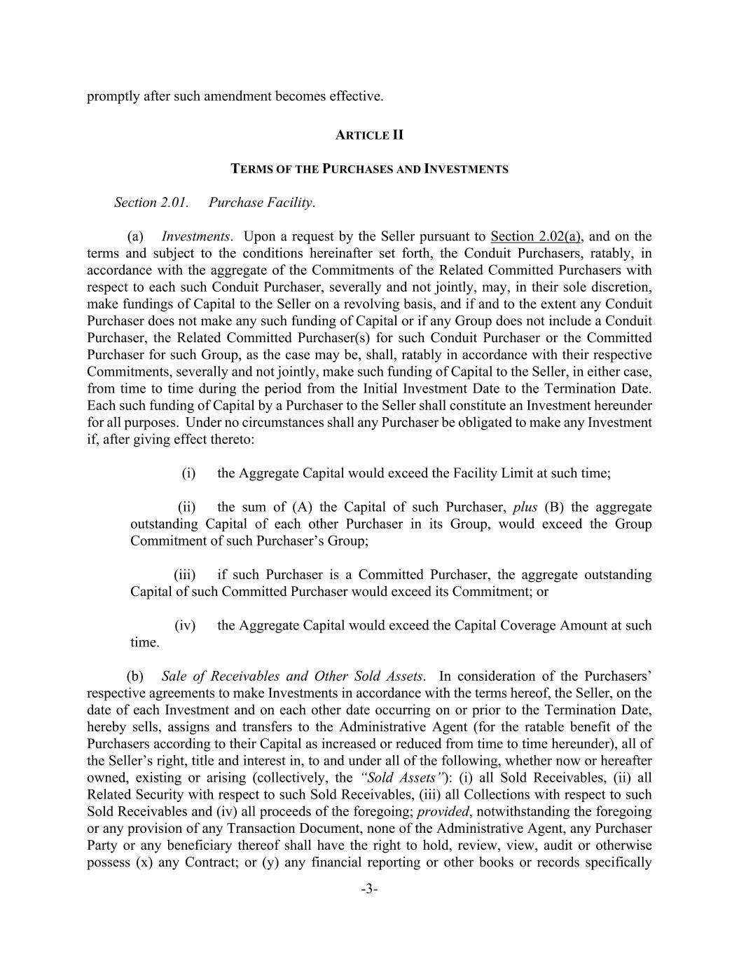 -3-该等修订生效后立即生效。第二条购买和投资条款第2.01款。购买设施。(a)投资。根据卖方根据第2.02(a)节提出的请求,并根据下文所列的条款和条件,管道买方可按比例根据相关承诺买方对每一此类管道买方的承诺的总和,个别地而不是共同地,全权酌情在循环的基础上向卖方提供资本资金,如果任何管道买方不提供任何此类资本资金,或者如果任何集团不包括管道买方,该等管道买方的相关承诺买方或该集团的承诺买方(视属何情况而定)须根据各自的承诺按比例分别而非共同向卖方提供该等资金,在任何一种情况下,均须于初始投资日期至终止日期期间不时向卖方提供该等资金。买方向卖方提供的每笔此类资金均应构成本协议项下所有目的的投资。在任何情况下,任何买方都没有义务进行任何投资,如果在生效后:(i)总资本将超过当时的融资限额;(ii)(a)该买方的资本加上(b)对方买方在其集团中的未偿还资本总额的总和,将超过该买方集团的集团承诺;(iii)如果该买方是承诺买方,则该承诺买方的未偿还资本总额将超过其承诺;或(iv)总资本将超过当时的资本保障金额。(b)出售应收款项和其他出售资产。考虑到买方各自同意根据本协议的条款进行投资,卖方在每项投资的日期以及在终止日期或之前发生的相互日期,特此出售、转让和转让给行政代理人(为买方根据其不时根据本协议增加或减少的资本的应课税利益),卖方在以下所有方面的所有权利、所有权和权益,无论是现在或以后拥有的、现有的或产生的(统称为“出售资产”):(i)所有已出售的应收款项,(ii)与该等已售应收款项有关的所有相关担保,(iii)与该等已售应收款项有关的所有收款,及(iv)前述的所有收益;但即使有前述规定或任何交易文件的任何规定,行政代理人、任何买方或其任何受益人均无权持有、审查、查看、审计或以其他方式拥有(x)任何合同;或(y)任何财务报告或其他账簿或记录具体