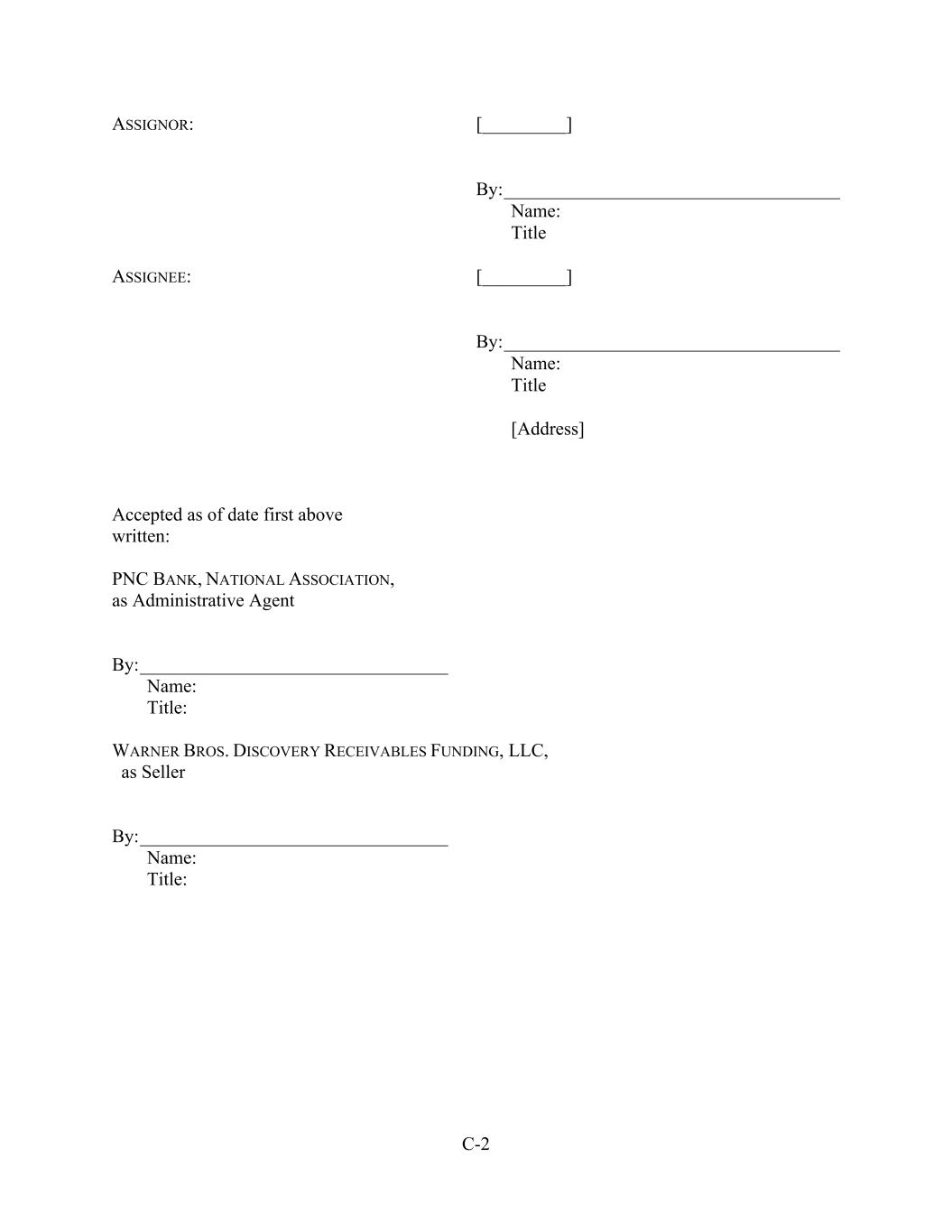 C-2转让人:[ __________ ]由:__________________________________ Name:Title Assignee:[ ______________ ]由:__________________________________________ Name:Title [ Address ] accepted as date first above written:NATION,As Administrative Agent by:__________________________________ Name:Title:WarnerDiscovery Receivables Funding,LLC,as seller by:__________________________________ Name:title: