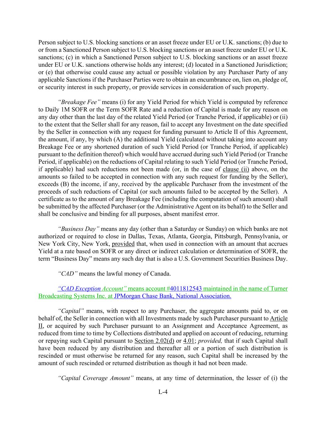 受美国封锁制裁或根据欧盟或英国制裁进行资产冻结的L-4人;(b)应受或来自受美国封锁制裁或根据欧盟或英国制裁进行资产冻结的受制裁人;(c)受美国封锁制裁或根据欧盟或英国制裁进行资产冻结的受制裁人以其他方式持有任何权益;(d)位于受制裁的司法管辖区;或(e)如果买方当事人要获得对任何适用制裁的产权负担、留置权,否则可能导致任何买方当事人实际或可能违反任何适用制裁,该等财产的质押或担保权益,或以该等财产为代价提供服务。“破损费”是指(i)任何收益期的收益率参照每日1M SOFR或定期SOFR利率计算,且在相关收益期(或分档期,如适用)的最后一天以外的任何一天因任何原因减少资本,或(ii)在卖方因任何原因未能在卖方根据本协议第二条就任何资金请求指定的日期接受任何投资的情况下,金额(如有),据此,(a)额外收益率(计算时未计及任何破碎费或根据其定义缩短的该收益期(或分档期,如适用)的期限)本应在该收益期(或分档期,如适用)内就与该收益期(或分档期,如适用)有关的资本减少而产生的额外收益率(或,在上述第(ii)条的情况下,就卖方任何此类资助请求而未能接受的金额而言)超过(b)收益(如有),适用的买方从投资中收到的此类减少资本的收益(或卖方未能接受此类金额)。有关任何破碎费金额(包括该金额的计算)的证明应由受影响的买方(或代表其的行政代理人)向卖方提交,并应是结论性的,对所有目的均具有约束力,无明显错误。“营业日”是指在德克萨斯州达拉斯、佐治亚州亚特兰大、宾夕法尼亚州匹兹堡或纽约州纽约市,银行未获授权或未被要求关闭的任何一天(周六或周日除外),前提是,当用于以基于SOFR的利率或任何直接或间接计算或确定SOFR的利率产生收益率的金额时,“营业日”一词是指同时也是美国政府证券营业日的任何此类日子。“CAD”是指加拿大的合法货币。“CAD异常账户”是指以Turner Broadcasting Systems Inc.名义在美国全国协会摩根大通银行维护的账户# 4011812543。就任何买方而言,“资本”是指就该买方根据第二条作出的所有投资或该买方根据转让和接受协议取得的所有投资向卖方支付或代表卖方获得的总额,该总额由根据第2.02(d)或4.01条减少、返还或偿还该等资本而不时分配和应用的收款减少;但前提是,如该等资本已因任何分配而减少,其后该等分配的全部或部分因任何理由而被撤销或必须以其他方式返还,则该等资本须按该等已撤销或返还的分配的金额增加,犹如未作出一样。“资本覆盖金额”是指,在任何确定时间,(i)中的较小者