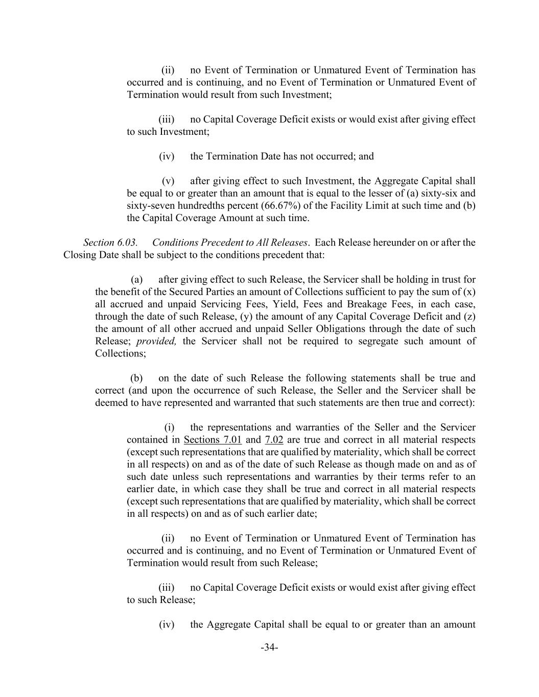 -34-(ii)没有发生任何终止事件或未成熟的终止事件,且仍在继续,且不会因该投资而导致任何终止事件或未成熟的终止事件;(iii)不存在或在该投资生效后将存在资本覆盖赤字;(iv)终止日期未发生;(v)在该投资生效后,总资本应等于或大于等于(a)当时融资限额的百分之六十六和百分之六十七(66.67%)和(b)当时的资本覆盖金额中较小者的金额。第6.03节。所有发布的先决条件。在截止日期当日或之后,本协议项下的每项解除均应遵守以下先决条件:(a)在该解除生效后,服务商应为有担保方的利益以信托方式持有足以支付(x)所有应计和未支付的服务费、收益率、费用和破碎费(在每种情况下,直至该解除日期)之和的收款金额,(y)任何资本覆盖赤字的金额,以及(z)截至该解除日期的所有其他应计和未支付的卖方债务的金额;但,不应要求服务商将此种数量的收款分开;(b)在此类发布之日,以下陈述应是真实和正确的(并且在发生此类发布时,卖方和服务商应被视为已陈述并保证此类陈述是真实和正确的):(i)第7.01和7.02节中所载的卖方和服务商的陈述和保证在所有重大方面都是真实和正确的(除非此类陈述在重要性方面有所限定,该等申述及保证在各方面均属正确)于该释放日期当日及截至该日,犹如在该日期及截至该日作出一样,除非该等申述及保证以其条款所指的是较早的日期,在该情况下,该等申述及保证于该较早日期当日及截至该日在所有重大方面均属真实及正确(但有关申述须在各方面均属正确);(ii)没有发生任何终止事件或未成熟的终止事件,且仍在继续,且不会因该解除而导致任何终止事件或未成熟的终止事件;(iii)不存在或在该解除生效后将存在资本覆盖赤字;(iv)总资本应等于或大于金额