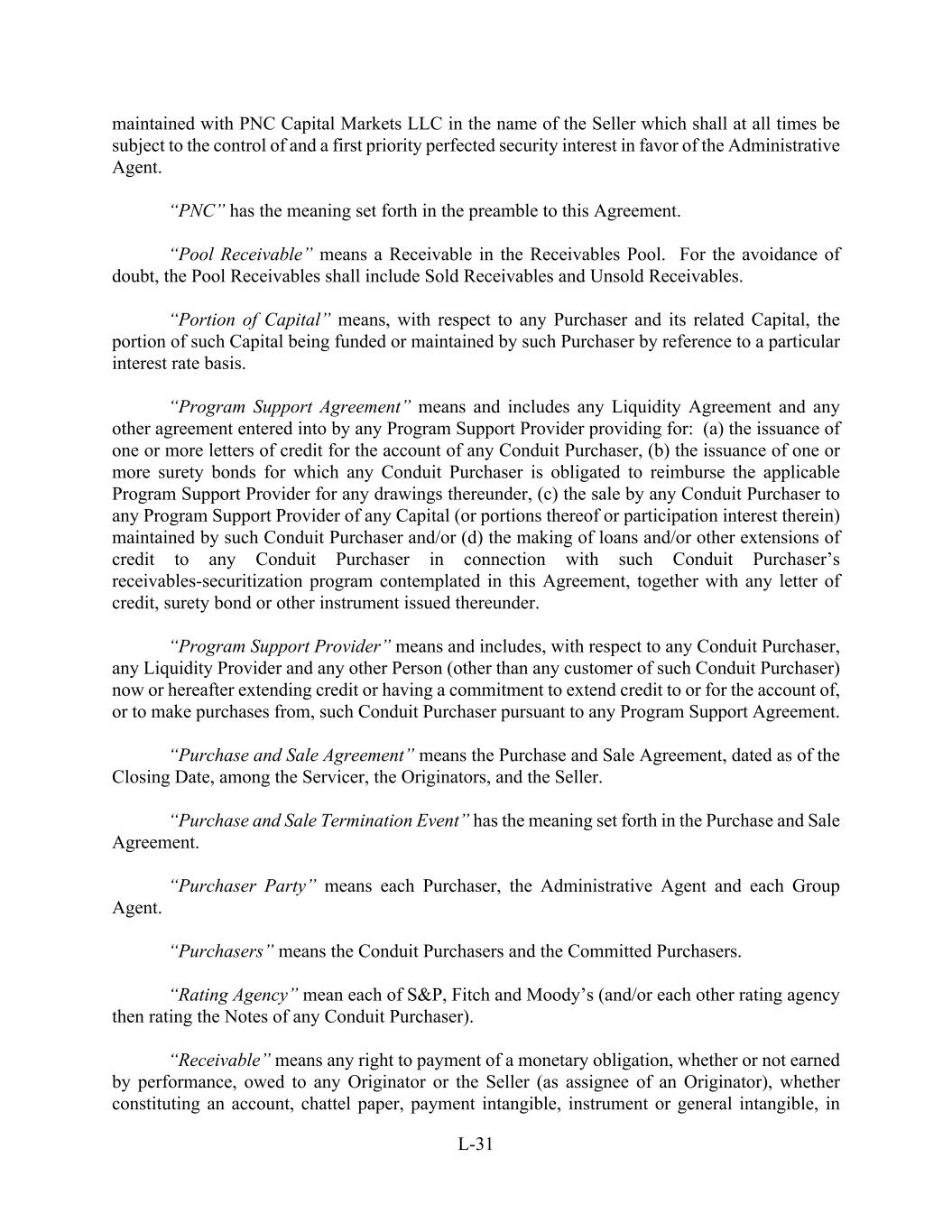 以卖方名义与PNC Capital Markets LLC维持的L-31在任何时候都应受制于行政代理人的控制和优先完善的担保权益。“PNC”具有本协议序言部分所述的含义。“应收款项池”是指应收款项池中的应收款项。为免生疑问,集合应收款应包括已售应收款项和未售应收款项。“部分资本”是指,就任何买方及其相关资本而言,此类资本由该买方参照特定利率基础提供资金或维持的部分。“方案支持协议”是指并包括任何方案支持提供商订立的任何流动性协议和任何其他协议,其中规定:(a)为任何管道购买者的账户签发一份或多份信用证,(b)发行一份或多份担保债券,而任何管道购买者有义务就其项下的任何图纸向适用的方案支持提供商进行偿付,(c)任何管道买方向任何计划支援供应商出售由该管道买方维持的任何资本(或其部分或其中的参与权益)和/或(d)就本协议所设想的该管道买方的应收款-证券化计划向任何管道买方提供贷款和/或其他信贷展期,以及根据该协议发行的任何信用证、担保债券或其他票据。“计划支持提供商”是指并包括,就任何管道购买者而言,任何流动性提供者和任何其他人(该管道购买者的任何客户除外)现在或以后提供信贷或承诺根据任何计划支持协议向该管道购买者提供信贷或为其账户提供信贷,或向其进行购买。“买卖协议”是指服务商、发起人和卖方之间日期为截止日期的买卖协议。“购销终止事件”具有购销协议约定的含义。“采购方”是指每个采购方、行政代理人和每个集团代理人。“购买者”是指管道购买者和承诺购买者。“评级机构”是指标普、惠誉和穆迪(和/或彼此的评级机构然后对任何导管购买者的票据进行评级)各自。“应收款项”是指对任何发起人或卖方(作为发起人的受让人)所欠的货币债务(无论是否通过履约赚取)的任何受付权,无论是构成账户、动产票据、支付无形资产、票据还是一般无形资产,在