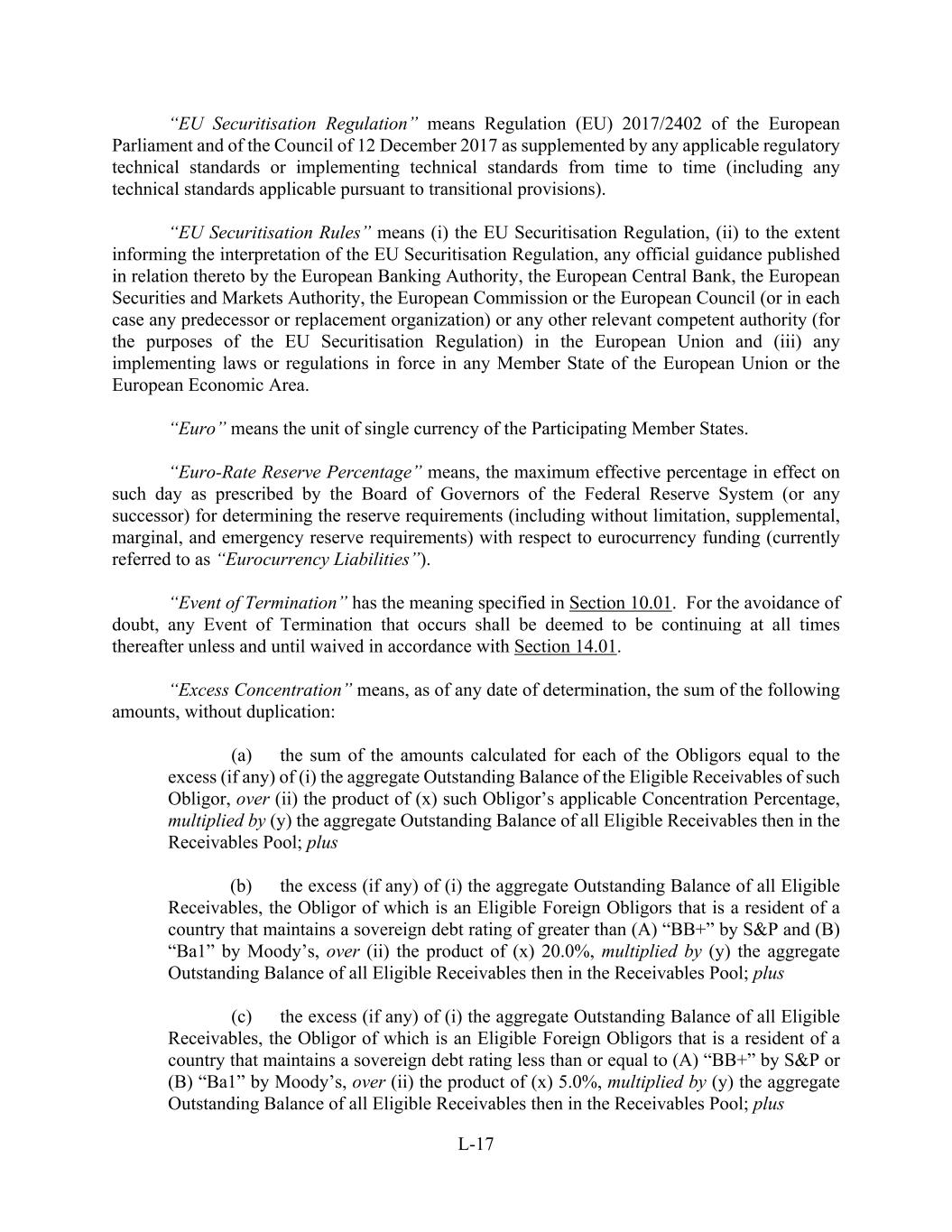 L-17“欧盟证券化条例”是指2017年12月12日欧洲议会和理事会的条例(EU)2017/2402,由任何适用的监管技术标准或不时实施的技术标准(包括根据过渡性条款适用的任何技术标准)作为补充。“欧盟证券化规则”是指(i)欧盟证券化条例,(ii)在为欧盟证券化条例的解释提供信息的范围内,欧洲银行管理局、欧洲中央银行、欧洲证券和市场管理局、欧盟委员会或欧洲理事会(或在每种情况下任何前身或替代组织)或欧盟任何其他相关主管机构(就欧盟证券化条例而言)发布的任何官方指南,以及(iii)在欧盟任何成员国或欧洲经济区有效的任何实施法律或条例。“欧元”是指参与成员国的单一货币单位。“欧元利率储备百分比”是指,联邦储备系统理事会(或任何继任者)为确定有关欧元货币资金(目前称为“欧元货币负债”)的准备金要求(包括但不限于补充、边际和紧急准备金要求)而规定的当日有效的最高百分比。“终止事件”具有第10.01条规定的含义。为免生疑问,发生的任何终止事件须当作在其后的任何时间持续,除非及直至根据第14.01条获豁免为止。“超额集中”是指,截至任何确定日期,下列金额之和,不重复:(a)为每一债务人计算的金额之和,等于(i)该债务人的合格应收款项的未偿余额总额超过(ii)(x)该债务人适用的集中百分比乘积,乘以(y)当时在应收款池中的所有合格应收款项的未偿余额总额;加上(b)(i)所有合格应收款项的未偿余额总额的超出部分(如有),其义务人是合格的外国义务人,该义务人是主权债务评级维持在(a)标普“BB +”和穆迪(b)“Ba1”以上的国家的居民,超过(ii)(x)20.0%的乘积,乘以(y)当时应收款池中所有合格应收款项的未偿余额总额;加上(c)(i)所有合格应收款项的未偿余额总额的超出部分(如有),其义务人是合格的外国义务人,该义务人是维持主权债务评级低于或等于(a)标普“BB +”或穆迪(b)“Ba1”的国家的居民,超过(ii)(x)5.0%的乘积,乘以(y)应收款池中当时所有合格应收款项的未偿余额总额;加上