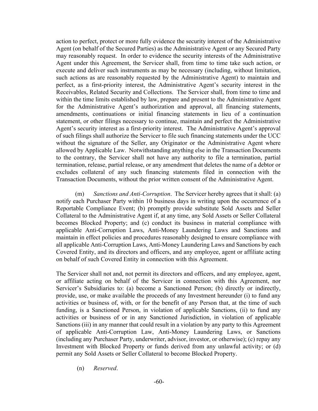 -60-作为行政代理人或任何有担保方合理要求的行政代理人(代表有担保方)完善、保护或更充分证明担保权益的行为。为证明行政代理人在本协议项下的担保权益,服务人应不时采取行动,或签立和交付可能需要的文书(包括但不限于行政代理人合理要求的行动),以维持和完善行政代理人在应收款、相关担保和收款中的担保权益,作为第一优先权权益。服务人应当在法律规定的期限内,不定期编制并向行政代理人提交经行政代理人授权和批准的所有融资报表、修改、延续或者初始融资报表,以代替延续报表,或者为延续、维持和完善行政代理人作为第一优先权益的担保权益所必需的其他备案。行政代理人对此类备案的批准,应授权服务商在适用法律允许的情况下无需卖方、任何发起人或行政代理人签名即可在UCC下提交此类融资报表。尽管交易文件中有其他相反的规定,未经行政代理人事先书面同意,服务商无权提出终止、部分终止、解除、部分解除或任何删除债务人名称或排除就交易文件提交的任何此类融资报表的抵押品的修改。(m)制裁和反腐败。服务商在此同意:(a)在发生应报告的合规事件后10个工作日内书面通知各买方;(b)在任何时候任何已售资产或卖方抵押品成为被封锁财产时,及时向行政代理人提供替代的已售资产和卖方抵押品;(c)在实质上遵守适用的反腐败法、反洗钱法和制裁的情况下开展业务,并保持有效的政策和程序,以合理设计,确保每个涵盖实体遵守所有适用的反腐败法、反洗钱法和制裁,及其董事和高级职员,以及代表该涵盖实体就本协议行事的任何雇员、代理人或关联公司。服务商不得、也不允许其董事和高级职员、代表服务商行事的任何雇员、代理人或关联公司与本协议有关,也不允许服务商的子公司:(a)成为受制裁人员;(b)直接或间接提供、使用或提供本协议项下任何投资的收益(i)为在提供资金时为受制裁人员的任何人的任何活动或业务提供资金,或为其利益提供资金,违反适用的制裁,(ii)为任何受制裁司法管辖区或在任何受制裁司法管辖区的任何活动或业务提供资金,违反适用制裁(iii)以任何可能导致本协议任何一方违反适用的反腐败法、反洗钱法或制裁(包括任何买方方、承销商、顾问、投资者或其他方面)的方式;(c)以被封锁的财产或任何非法活动所得资金偿还任何投资;或(d)允许任何出售的资产或卖方抵押品成为被封锁的财产。(n)保留。