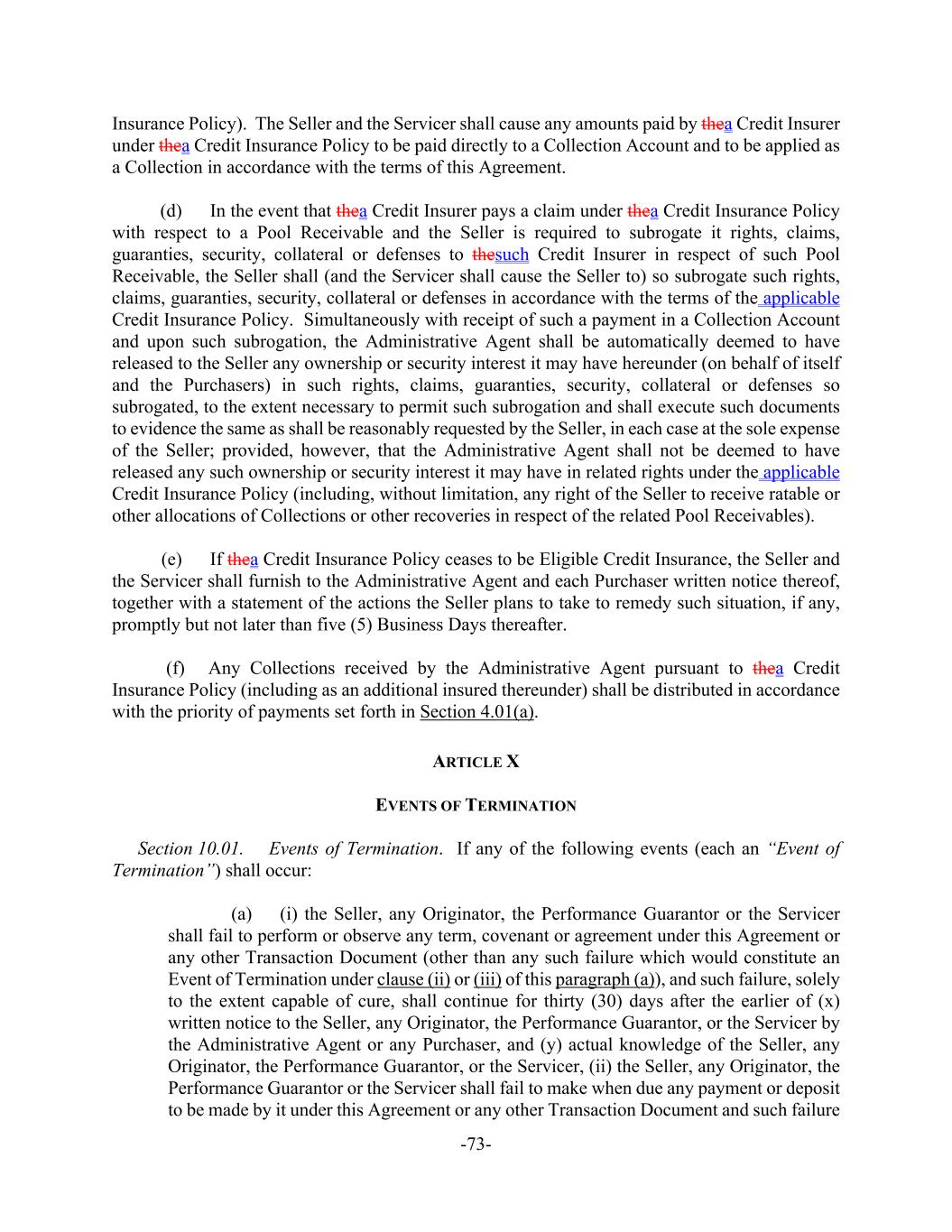 -73-保险单)。卖方和服务商应促使信用保险公司根据信用保险单支付的任何金额直接支付到收款账户,并根据本协议条款作为收款应用。(d)如果信用保险公司根据信用保险单就应收款项池支付索赔,而卖方被要求就该应收款项池向该信用保险公司代位行使其权利、索赔、担保、担保、抵押品或抗辩,则卖方应(且服务商应促使卖方)根据适用的信用保险单的条款如此代位行使该等权利、索赔、担保、担保、抵押品或抗辩。在收款账户收到此种付款的同时并在此种代位权时,行政代理人应自动被视为已向卖方解除其(代表其本身和买方)在如此代位权的此种权利、债权、担保、担保、担保物或抗辩中根据本协议可能拥有的任何所有权或担保权益,但以允许此种代位权为必要范围,并应签署与卖方合理要求的相同的证明文件,在每种情况下均由卖方承担费用;但前提是,行政代理人不得被视为已解除其在适用的信用保险单下的相关权利(包括但不限于卖方就相关集合应收款收取应课税或其他分配的收款或其他追偿的任何权利)中可能拥有的任何此类所有权或担保权益。(e)如果信用保险单不再是合格的信用保险,卖方和服务商应立即但不迟于其后五(5)个工作日向行政代理人和每个买方提供书面通知,连同卖方计划采取的补救此类情况的行动(如有)的声明。(f)行政代理人根据信用保险单收到的任何收款(包括作为根据该保险单的额外受保人),应按照第4.01(a)节规定的付款优先权进行分配。第十条终止第10.01款的事项。终止的事件。如发生以下任何事件(每项均为“终止事件”):(a)(i)卖方、任何发起人、履约担保人或服务商不履行或遵守本协议或任何其他交易文件项下的任何条款、契诺或协议(任何该等未履行将构成本(a)款第(ii)或(iii)款下的终止事件的除外),且该等未履行仅在能够补救的范围内,应在(x)向卖方、任何发起人、履约担保人发出书面通知(以较早者为准)后三十(30)天内持续,或行政代理人或任何买方的服务人,及(y)卖方、任何发起人、履约保证人或服务人的实际知悉情况,(ii)卖方、任何发起人、履约保证人或服务人在到期时未能根据本协议或任何其他交易文件支付其应支付的任何款项或按金,而该等未能