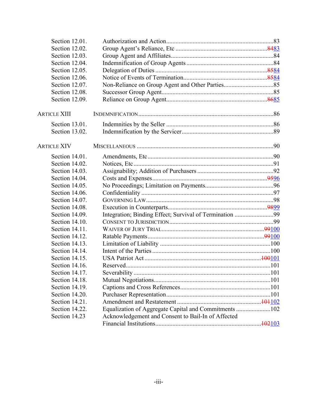 -III-第12.01节。授权和行动.....................................................................83第12.02节。集团代理的依赖等...................................................................8483第12.03节。集团代理和关联公司......................................................................84第12.04节。团体代理人的赔偿......................................................84第12.05节。职责下放......................................................................8584第12.06节。终止事项的通知......................................................................8584第12.07节。不依赖集团代理人及其他当事人.................................85第12.08节。继承组代理......................................................................85第12.09节。对集团代理人的依赖......................................................................8685第十三条赔偿.......................................................................................86第13.01节。卖方的赔偿.....................................................................................86第13.02节。服务人的赔偿...................................................................89第十四条杂项......................................................................................90第14.01节。修正案等.....................................................................................90第14.02节。通知等..................................................................................................91第14.03节。可转让性;增加购买人.................................................92第14.04节。成本费用..................................................................................9 596第14.05节。没有诉讼程序;对付款的限制....................................................96第14.06节。保密.....................................................................................97第14.07节。管治法...................................................................................................98第14.08节。在对应方执行................................................................9 899第14.09节。整合;绑定效应;终止存续......................99第14.10节。对管辖权的同意...................................................................................99第14.11节。放弃陪审团审判..................................................................................99 100第14.12节。应课税款项...................................................................................99 100第14.13节。责任限制.................................................................... 100第14.14节。各方的意向.................................................................... 100第14.15节。美国爱国者法案.................................................................... 100101第14.16节。保留.................................................................................... 101第14.17节。可分割性.................................................................................... 101第14.18节。相互协商.................................................................... 101第14.19节。标题和交叉引用.................................................................... 101第14.20节。买方代表.................................................................... 101第14.21节。修订及重述......................................................10 1102第14.22条。均衡的总资本和承诺......................102第14.23节受影响的金融机构的担保和同意保释.................................................................................... 10 2103