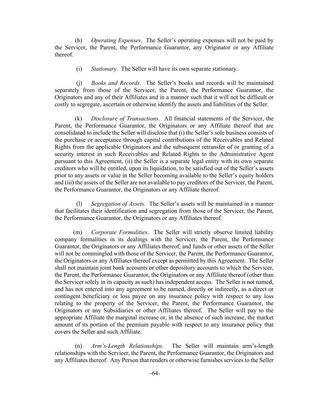-64-(h)营业费用。卖方的运营费用将不会由服务商、母公司、履约保证人、任何发起人或其任何关联公司支付。(i)固定式。卖方将拥有自己的独立文具。(j)账簿和记录。卖方的账簿和记录将与服务商、母公司、履约担保人、发起人及其任何关联公司的账簿和记录分开保存,并以这样的方式进行分离、确定或以其他方式识别卖方的资产和负债不会有困难或成本高昂。(k)交易披露。服务商、母公司、履约保证人、发起人或其任何关联公司的所有财务报表合并以包括卖方将披露:(i)卖方的唯一业务包括通过向适用的发起人出资购买或接受应收款及相关权利,以及随后根据本协议将此类应收款及相关权利的担保权益重新转让或授予行政代理人,(ii)卖方是一个独立的法律实体,拥有自己的独立债权人,在清算时将有权,在卖方的任何资产或价值可供卖方的股权持有人使用之前从卖方的资产中清偿,以及(iii)卖方的资产无法用于支付服务商、母公司、履约担保人、发起人或其任何关联公司的债权人。(l)资产隔离。卖方的资产将以便于识别和隔离的方式与服务商、母公司、履约担保人、发起人或其任何关联公司的资产进行维护。(m)公司手续。卖方在与服务商、母公司、履约保证人、发起人或其任何关联人的交易中将严格遵守有限责任公司的手续,卖方的资金或其他资产将不会与服务商、母公司、履约保证人、发起人或其任何关联人的资金或其他资产混合,除非本协议允许。卖方不得维持服务方、母公司、履约担保人、发起人或其任何关联机构(服务方仅以其本身身份除外)可独立访问的联名银行账户或其他存管账户。卖方没有被点名,也没有就与服务商、母公司、履约担保人、发起人或其任何子公司或其其他关联公司的财产有关的任何损失作为任何保险单上的直接或或有受益人或损失受款人订立任何协议直接或间接被点名。卖方将向适当的关联公司支付边际增加,或在没有此类增加的情况下,就涵盖卖方和该关联公司的任何保险单支付其应支付的保费部分的市场金额。(n)臂长关系。卖方将与服务商、母公司、履约担保人、发起人及其任何关联公司保持公平的关系。向卖方提供或以其他方式提供服务的任何人