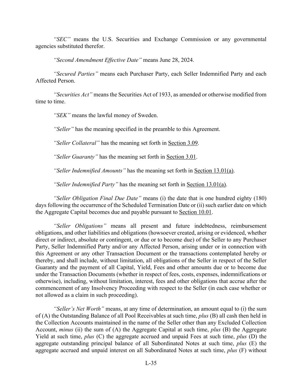 L-35“SEC”是指美国证券交易委员会或任何替代的政府机构。“第二修正案生效日期”指2024年6月28日。“担保方”是指每一买方、每一卖方受偿方和每一受影响的人。“证券法”是指经不时修订或以其他方式修订的1933年《证券法》。“SEK”是指瑞典的合法货币。“卖方”具有本协议序言部分规定的含义。“卖方抵押品”具有第3.09节规定的含义。“卖方担保”具有第3.01节规定的含义。“卖方赔偿金额”具有第13.01(a)节中规定的含义。“卖方受偿方”具有第13.01(a)节规定的含义。“卖方义务最终到期日”是指(i)计划终止日期发生后一百八十(180)天的日期,或(ii)根据第10.01条,总资本到期应付的较早日期。“卖方义务”是指根据本协议或任何其他交易文件或据此设想的交易产生的或与之相关的卖方对任何买方方、卖方受赔偿方和/或任何受影响的人的所有当前和未来债务、偿付义务以及其他责任和义务(无论产生、产生或证明,无论是直接或间接、绝对或或或或到期或到期或即将到期),应包括但不限于卖方就卖方担保和支付所有资本、收益率、根据交易文件到期或将要到期的费用和其他金额(无论是否涉及费用、成本、开支、赔偿或其他方面),包括但不限于利息、费用和在任何破产程序启动后对卖方产生的其他义务(在每种情况下,无论是否允许作为此类程序中的索赔)。“卖方净资产”是指,在任何确定时间,金额等于(i)(a)当时所有集合应收账款的未偿余额之和,加上(b)当时以卖方名义保存的收款账户中的所有现金,但不包括任何不包括的收款账户,减去(ii)(a)当时的总资本,加上(b)当时的总收益率,再加上(c)当时的应计和未付费用总额,再加上(d)当时所有次级票据的未偿本金总额,加上(e)当时所有次级票据的应计及未付利息总额,加上(f)不