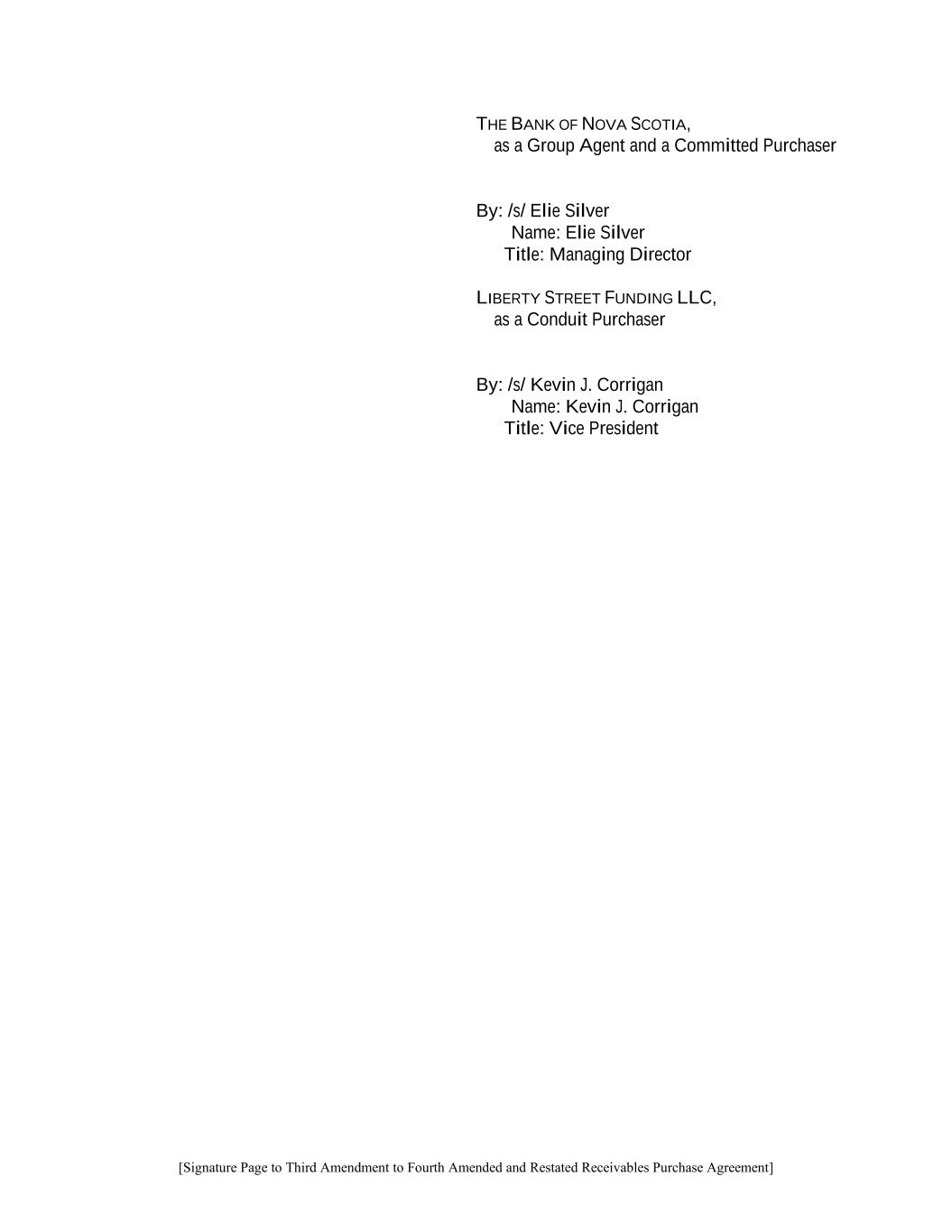 【第四次修订和重述的应收账款购买协议第三次修订的签署页】新斯科舍银行,作为集团代理和承诺的购买者:/s/Elie Silver姓名:Elie Silver职务:董事总经理LIBERTY STREET FUNDING LLC,作为管道购买者:/s/Kevin J. Corrigan姓名:Kevin J. Corrigan职务:副总裁
