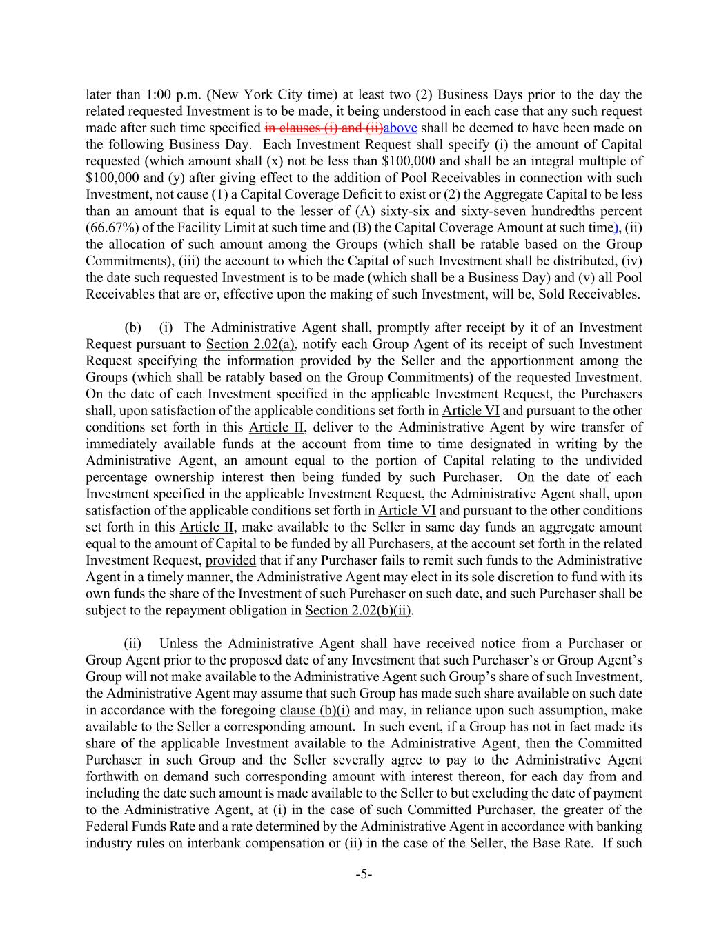 -5-晚于下午1:00(纽约市时间)至少两(2)个工作日前进行相关请求投资,但在每种情况下的理解是,在上述第(i)和(ii)条规定的时间之后提出的任何此类请求应被视为已在下一个工作日提出。每份投资请求应具体说明(i)请求的资本金额(该金额应(x)不低于100,000美元,且应是100,000美元的整数倍,以及(y)在与该投资相关的集合应收账款生效后,不会导致(1)存在资本覆盖赤字或(2)总资本低于等于(a)当时融资限额的百分之六十六和六十七点七(66.67%)和(b)当时的资本覆盖金额中较小者的金额,(ii)在各集团之间分配该等金额(应根据集团承诺按比例分配),(iii)该等投资的资本应分配至的账户,(iv)作出该等要求的投资的日期(该日期应为营业日),及(v)在作出该等投资时生效的所有集合应收账款将为已售应收账款。(b)(i)行政代理人在收到根据第2.02(a)节提出的投资请求后,应立即将其收到的投资请求通知每个集团代理人,该投资请求指明了卖方提供的信息以及所要求的投资在集团之间的分配(应根据集团承诺按比例分配)。在适用的投资请求书中规定的每项投资之日,买方应在满足第六条规定的适用条件后并依据本条第二条规定的其他条件,以电汇方式将行政代理人不时书面指定的账户上的即时可用资金交付给行政代理人,金额相当于该买方当时出资的与不可分割的百分比所有权权益有关的资本部分。在适用的投资请求书规定的每笔投资之日,行政代理人在满足第六条规定的适用条件后,按照本第二条规定的其他条件,在相关投资请求书规定的账户上向卖方当日提供总额等于所有买方拟出资金额的资金,但如任何买方未能及时将该等资金汇给行政代理人,行政代理人可全权酌情选择以自有资金为该买方在该日期的投资份额提供资金,该买方应遵守第2.02(b)(ii)节中的还款义务。(ii)除非行政代理人在任何投资的拟议日期之前已收到买方或集团代理人的通知,该买方或集团代理人的集团将不会向行政代理人提供该集团在该投资中的份额,否则行政代理人可假定该集团已根据前述(b)(i)条在该日期提供该份额,并可依据该假设向卖方提供相应的金额。在这种情况下,如果一集团实际上并未向行政代理人提供其在适用投资中的份额,则该集团中的承诺买方和卖方分别同意应要求立即向行政代理人支付相应的金额及其利息,自向卖方提供该金额之日起的每一天(包括该日期在内),但不包括向行政代理人付款之日,就该承诺买方而言,在(i),联邦基金利率和行政代理人根据银行业同业报酬规则确定的利率中的较大者,或(ii)在卖方的情况下,基准利率。如果这样