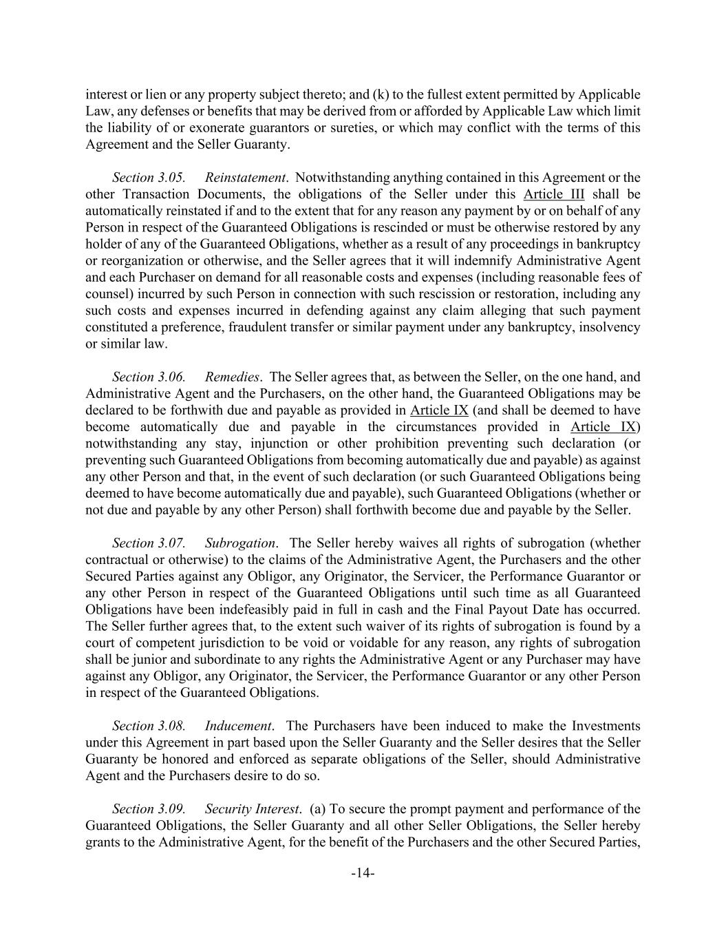 -14-利息或留置权或受其约束的任何财产;(k)在适用法律允许的最大范围内,可能源自或由适用法律提供的限制担保人或担保人的责任或免除其责任的任何抗辩或利益,或可能与本协议和卖方担保的条款相冲突的任何抗辩或利益。第3.05节。复职。尽管本协议或其他交易文件中有任何规定,卖方根据本条第三款承担的义务应自动恢复,如果出于任何原因,由任何人或代表任何人就担保义务支付的任何款项被撤销或必须由任何担保义务的任何持有人以其他方式恢复,无论是由于破产或重组中的任何程序或其他原因,且卖方同意,其将应要求赔偿行政代理人和每个买方因此类撤销或恢复而产生的所有合理成本和费用(包括合理的律师费),包括为抗辩任何声称此类付款构成任何破产、无力偿债或类似法律下的优先、欺诈性转移或类似付款的索赔而产生的任何此类成本和费用。第3.06节。补救措施。卖方同意,在卖方与行政代理人和买方之间,可宣布担保义务按照第九条的规定立即到期应付(并在第九条规定的情况下被视为自动到期应付),尽管有任何中止、强制令或其他禁止阻止此类声明(或阻止此类担保义务成为自动到期应付)针对任何其他人,并且,在发生此种声明(或此种担保债务被视为自动到期应付)的情况下,此种担保债务(无论是否由任何其他人到期应付)应立即由卖方到期应付。第3.07节。代位权。卖方特此放弃对行政代理人、买方和其他有担保当事人就担保义务向任何债务人、任何发起人、服务人、履约担保人或任何其他人提出的债权的所有代位求偿权(无论是合同规定的还是其他方式的),直至所有担保义务均已不可撤销地以现金全额支付且最终支付日期已发生。卖方进一步同意,在有管辖权的法院认为其代位求偿权的放弃因任何原因无效或可作废的范围内,任何代位求偿权应是次要的,并从属于行政代理人或任何买方就所担保义务对任何义务人、任何发起人、服务人、履约担保人或任何其他人可能拥有的任何权利。第3.08节。诱导。买方已被诱导根据本协议进行部分基于卖方担保的投资,并且卖方希望卖方担保作为卖方的单独义务得到履行和强制执行,如果行政代理人和买方希望这样做的话。第3.09节。担保权益。(a)为保证担保义务、卖方担保和所有其他卖方义务的及时支付和履行,卖方为买方和其他有担保当事人的利益,特此授予行政代理人,