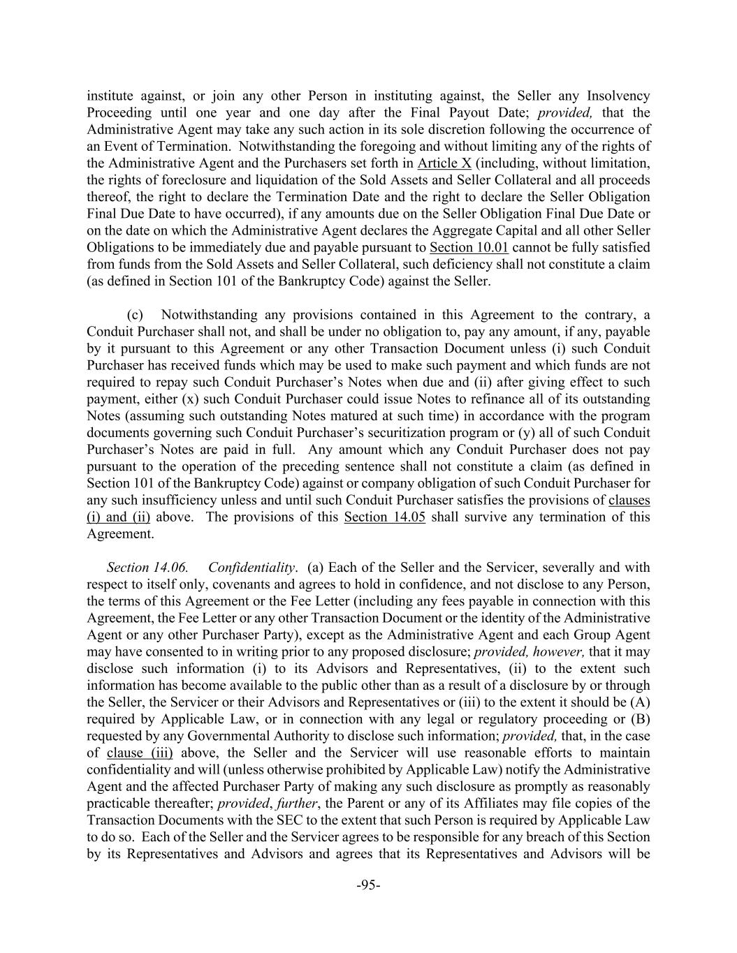 -95-对卖方发起任何破产程序,或与任何其他人一起对卖方发起任何破产程序,直至最终支付日期后一年零一天;但行政代理人可在终止事件发生后全权酌情采取任何此类行动。尽管有上述规定,且不限制第十条规定的行政代理人和买方的任何权利(包括但不限于被出售资产和卖方担保物及其全部收益的止赎和清算权利、宣布终止日期的权利和宣布卖方义务最终到期日期已经发生的权利),如果在卖方债务最终到期日或在行政代理人根据第10.01条宣布总资本和所有其他卖方债务立即到期和应付之日到期的任何金额不能完全从出售资产和卖方抵押品的资金中得到满足,则此类不足不应构成对卖方的索赔(定义见《破产法》第101条)。(c)尽管本协议中有任何相反的规定,管道买方不得、也无义务支付其根据本协议或任何其他交易文件应付的任何金额(如有),除非(i)该管道买方已收到可用于支付该款项的资金,且该资金不需要在到期时偿还该管道买方的票据,以及(ii)在该付款生效后,(x)该等管道买方可以根据管辖该管道买方证券化计划的程序文件发行票据为其所有未偿还票据(假设该等未偿还票据在该时间到期)再融资,或(y)该等管道买方的所有票据均已全额支付。任何导管购买者未根据前一句的操作支付的任何金额不应构成针对该导管购买者的任何此类不足的索赔(定义见《破产法》第101条)或公司义务,除非且直到该导管购买者满足上述第(i)和(ii)条的规定。本第14.05条的规定应在本协议的任何终止后继续有效。第14.06节。保密。(a)卖方和服务商各自(仅就其自身)订立契约并同意以保密方式持有本协议或费用函(包括就本协议、费用函或任何其他交易文件或行政代理人或任何其他买方方的身份而应支付的任何费用)的条款,但作为行政代理人和各集团代理人在任何拟议披露之前可能已书面同意的除外;然而,前提是,它可以(i)向其顾问和代表披露此类信息,(ii)在此类信息已可供公众获取的范围内,而不是由于卖方、服务商或其顾问和代表的披露,或(iii)在适用法律应(a)要求的范围内,或与任何法律或监管程序有关,或(b)任何政府当局要求披露此类信息;但在上述第(iii)款的情况下,卖方和服务商将尽合理努力保持机密性,并将(除非适用法律另有禁止)通知行政代理人和受影响的买方在此后在合理可行的范围内尽快作出任何此类披露;此外,前提是母公司或其任何关联公司可以在适用法律要求该人这样做的范围内向SEC提交交易文件的副本。卖方和服务商各自同意对其代表和顾问违反本节的任何行为负责,并同意其代表和顾问将