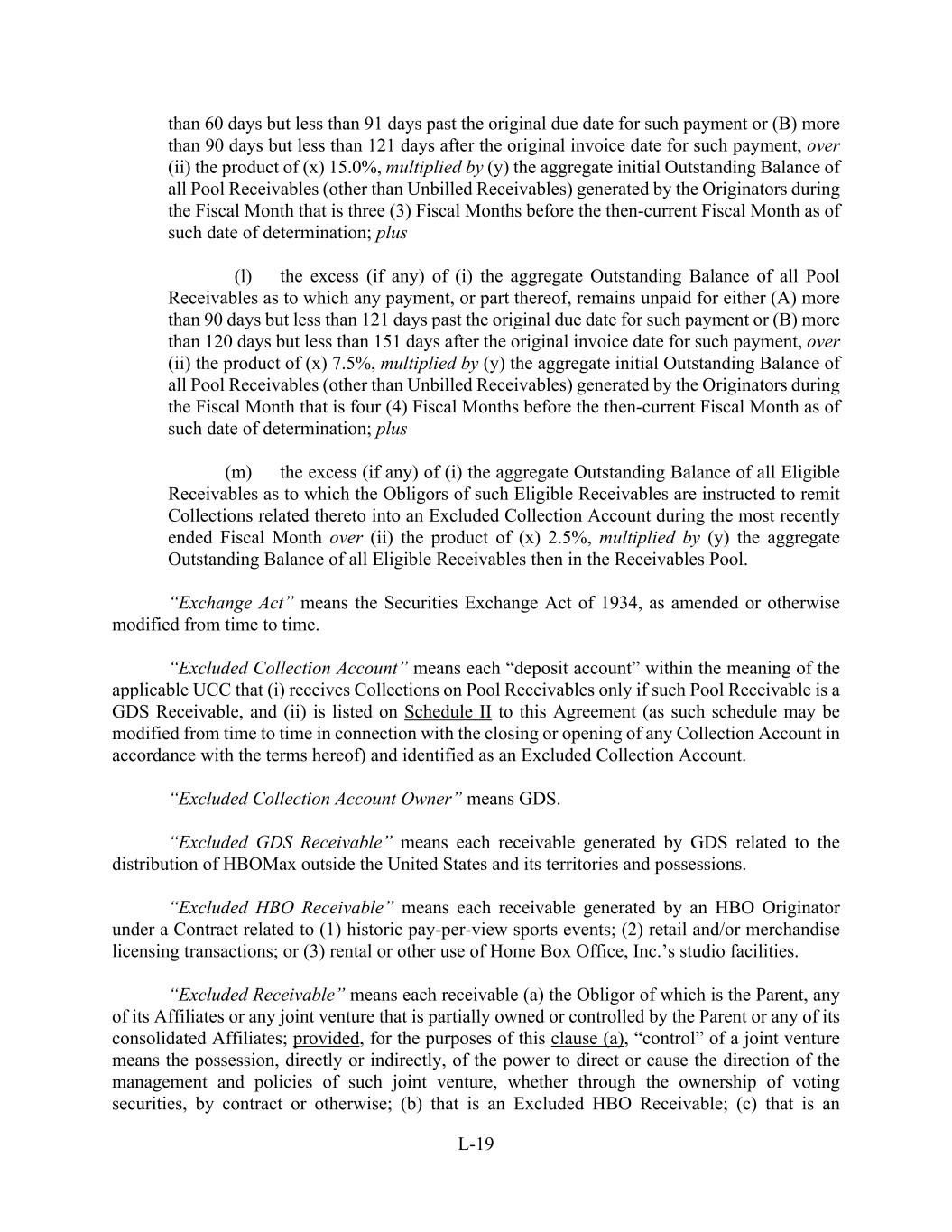 L-19较该等付款的原到期日逾60天但少于91天或(b)较该等付款的原发票日期逾90天但少于121天,超过(ii)(x)15.0%的乘积,乘以(y)发起人在截至该确定日期的当前财政月前三(3)个财政月的财政月内产生的所有集合应收账款(未开票应收账款除外)的初始未偿余额总额;加上(l)(i)所有集合应收账款的未偿余额总额的超出部分(如有),任何付款或其中的一部分,(a)该等付款的原定到期日期后超过90天但少于121天,或(b)该等付款的原定发票日期后超过120天但少于151天,超过(ii)(x)7.5%的乘积,乘以(y)发起人在截至该确定日期的当前财政月前四(4)个财政月内产生的所有集合应收款(未开票应收款除外)的初始未偿余额总额;加上(m)(i)所有合格应收款的未偿余额总额(如有)的超出部分(如有),指示此类合格应收款的债务人在最近结束的财政月内将与此相关的收款汇入不包括在内的收款账户,超过(ii)(x)2.5%的乘积,乘以(y)应收款池中所有符合条件的应收账款的未偿余额总和。“交易法”是指经不时修订或以其他方式修订的1934年《证券交易法》。“除外催收账户”是指适用的UCC所指的每个“存款账户”,即(i)仅当集合应收账款为应收账款,且(ii)已在本协议附表II中列出(因为该附表可能会根据本协议的条款就任何催收账户的关闭或开立而不时修改)并被识别为除外催收账户。“被排除在外的收款账户所有者”是指GDS。“不包括的GDS应收款项”是指GDS产生的与在美国境外及其领土和属地分销HBOMax相关的每一笔应收款项。“不包括HBO应收款”是指HBO发起人根据与(1)历史性的按次付费体育赛事;(2)零售和/或商品许可交易;或(3)出租或以其他方式使用Home Box Office,Inc.的工作室设施相关的合同产生的每笔应收款。“除外应收款”是指每笔应收款(a)其义务人是母公司、其任何关联公司或由母公司或其任何合并关联公司部分拥有或控制的任何合资企业;但就本条款而言,“控制”合资企业是指直接或间接拥有通过合同或其他方式指导或导致该合资企业的管理和政策方向的权力;(b)这是被排除的HBO应收款;(c)这是一