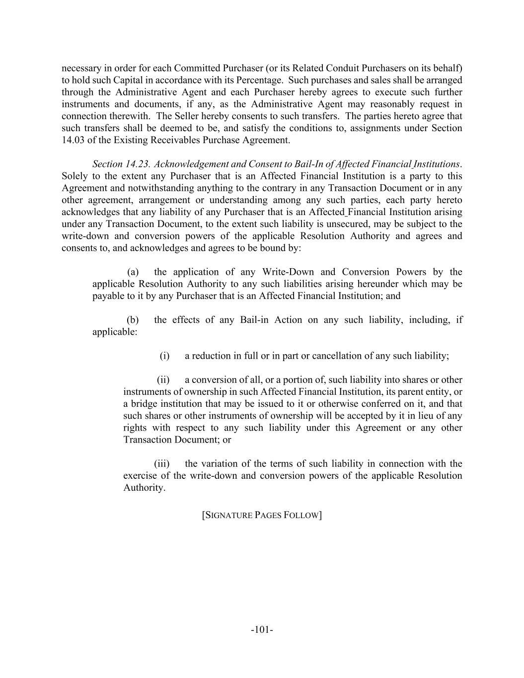 -101-必要,以便每个承诺的购买者(或其代表的相关管道购买者)按照其百分比持有此类资本。此类采购和销售应通过行政代理人安排,且每一买方在此同意签署行政代理人可能合理要求的与此相关的进一步文书和文件(如有)。卖方特此同意此类转让。双方同意,此类转让应被视为是现有应收款购买协议第14.03节项下的转让,并满足其条件。第14.23节。确认并同意受影响的金融机构的纾困。仅在作为受影响金融机构的任何买方是本协议的一方的情况下,尽管在任何交易文件或任何此类各方之间的任何其他协议、安排或谅解中有任何相反的规定,本协议的每一方均承认,作为受影响金融机构的任何买方在任何交易文件下产生的任何责任,在此种责任是无担保的情况下,可能受适用的解决机构的减记和转换权力的约束,并同意并同意,并承认并同意受以下约束:(a)适用的解决机构对根据本协议产生的任何此类负债适用任何减记和转换权,这些负债可能由任何作为受影响金融机构的买方支付给它;(b)任何纾困行动对任何此类负债的影响,包括(如适用):(i)全部或部分减少或取消任何此类负债;(ii)将此类负债的全部或部分转换为该受影响金融机构及其母实体的股份或所有权的其他工具,或可能向其发行或以其他方式授予其的过桥机构,且该等股份或其他所有权文书将由其接受,以代替与本协议或任何其他交易文件项下的任何此类责任有关的任何权利;或(iii)与行使适用的处置当局的减记和转换权力有关的此类责任条款的变更。[签名页如下]