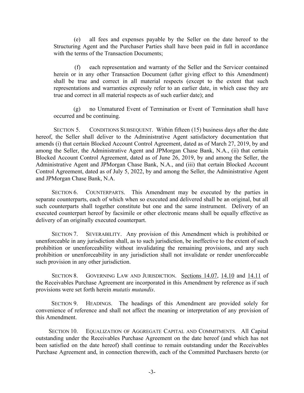 -3-(e)卖方在本协议日期应支付给结构代理和买方各方的所有费用和开支应已按照交易文件的条款全额支付;(f)本协议或任何其他交易文件(在本修订生效后)中所载的卖方和服务商的每项陈述和保证在所有重大方面均应真实和正确(除非此类陈述和保证明确提及较早的日期,在这种情况下,截至该较早日期,它们在所有重大方面都是真实和正确的);及(g)任何未成熟的终止事件或终止事件均不得已发生并仍在继续。第5节。随后的条件。在本协议日期后十五(15)个工作日内,卖方应向行政代理人交付令人满意的文件,该文件应修订(i)卖方、行政代理人和摩根大通 Bank,N.A.于2019年3月27日签署的某些被封锁账户控制协议,(ii)卖方、行政代理人和摩根大通 Bank,N.A.于2019年6月26日签署的某些被封锁账户控制协议,以及(iii)卖方于2022年7月5日签署的某些被封锁账户控制协议,行政代理人和摩根大通银行,N.A. SECTION 6。对应物。本修正案可由当事人分立的对应方签署,经如此签署和交付的每一份修正案均为正本,但所有这些对应方共同构成的文书只有一份和同一份文书。以传真或者其他电子方式送达被执行对应方,应当与送达原被执行对应方具有同等效力。第7节。可分离性。本修正案中任何在任何司法管辖区被禁止或不可执行的条款,就该司法管辖区而言,在该禁止或不可执行的范围内无效,而不会使其余条款无效,且任何司法管辖区的任何该等禁止或不可执行不得使该等条款在任何其他司法管辖区无效或不可执行。第8节。管辖法律和管辖权。应收款项购买协议第14.07、14.10和14.11节通过引用并入本修订,如同这些条款在此作了比照规定。第9节。标题。本修正案的标题仅为方便参考而提供,不影响本修正案任何条款的含义或解释。第10节。总资本和承诺的均等化。应收款项购买协议项下于本协议日期的所有未偿还资本(且于本协议日期尚未清偿)应继续根据应收款项购买协议以及与此相关的每一承诺买方(或