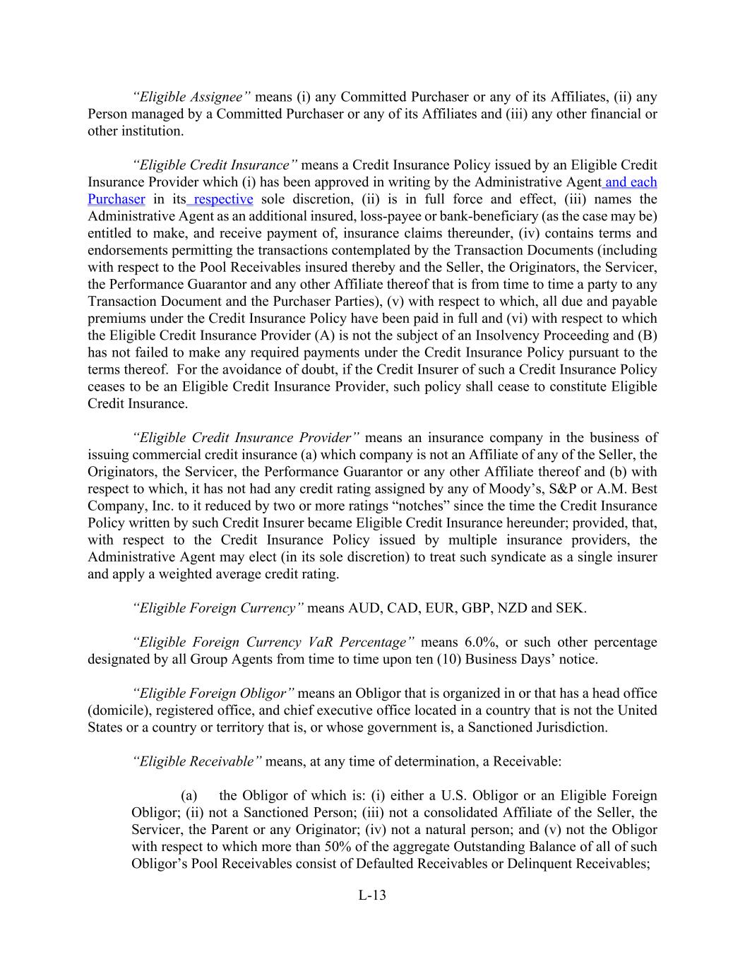 L-13“合格受让人”是指(i)任何承诺的购买者或其任何关联公司,(ii)由承诺的购买者或其任何关联公司管理的任何人,以及(iii)任何其他金融或其他机构。“合资格信用保险”是指由合资格信用保险提供商签发的信用保险单,该保险单(i)已获得行政代理人和每一买方各自全权酌情决定的书面批准,(ii)具有完全效力和效力,(iii)将行政代理人指定为额外的被保险人、损失受款人或银行受益人(视情况而定)有权根据该保险单提出和收取保险索赔,(iv)包含允许交易文件所设想的交易的条款和背书(包括就由此投保的集合应收款和卖方、发起人、服务商,履约保证人及其任何其他附属公司不时成为任何交易文件的一方及买方各方),(v)就其而言,信用保险单项下的所有到期和应付保费已全额支付,以及(vi)就其而言,合资格信用保险提供商(a)不是破产程序的主体,且(b)没有未根据其条款根据信用保险单支付任何所需付款。为免生疑问,该信用保险单的信用保险人不再是合资格信用保险提供者的,该保单不再构成合资格信用保险。“合资格信用保险提供商”是指从事签发商业信用保险业务的保险公司(a)该公司不是任何卖方、发起人、服务商、履约保证人或其任何其他关联公司的关联公司,以及(b)该公司未获得任何穆迪、标普或A.M. Best Company,Inc.授予其的任何信用评级,自该信用保险公司承保的信用保险单成为本项下的合格信用保险时起降低两个或更多评级“等级”;但前提是,对于由多个保险提供者签发的信用保险单,行政代理人可以(自行决定)选择将该银团视为单一保险人,并适用加权平均信用评级。“合格外币”是指澳元、加元、欧元、英镑、纽元和瑞典克朗。“合资格外币VaR百分比”指6.0%,或所有集团代理在十(10)个工作日通知后不时指定的其他百分比。“合格外国义务人”是指在不属于美国的国家或属于或其政府属于受制裁管辖的国家或地区组织或拥有总部(住所)、注册办事处和首席执行官办公室的义务人。“合格应收款”是指在任何确定时间,应收款项:(a)其债务人是:(i)美国债务人或合格外国债务人;(ii)不是受制裁的人;(iii)不是卖方、服务商、母公司或任何发起人的合并关联公司;(iv)不是自然人;(v)不是所有此类债务人的集合应收款的未偿余额总额的50%以上由违约应收款或拖欠应收款组成的债务人;