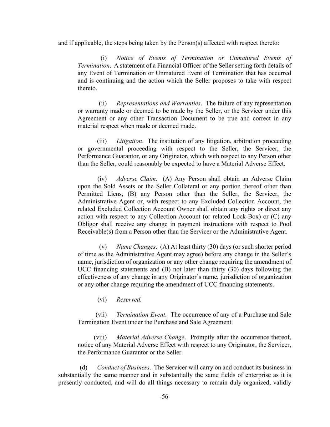 -56-以及如适用,受影响的人(s)正就此采取的步骤:(i)终止事项的通知或未成熟的终止事项。卖方财务官员的声明,其中载列已发生和正在继续的任何终止事件或未成熟的终止事件的详细信息,以及卖方提议就此采取的行动。(ii)申述及保证。卖方或服务商根据本协议或任何其他交易文件作出或被视为作出的任何陈述或保证在作出或被视为作出时未能在任何重要方面是真实和正确的。(三)诉讼。就卖方、服务人、履约保证人或任何发起人提起任何诉讼、仲裁程序或政府程序,而就卖方以外的任何人而言,可以合理地预期这些诉讼、仲裁程序或政府程序会产生重大不利影响。(四)不利索赔。(a)任何人须就出售资产或卖方抵押品或其任何部分取得除许可留置权外的反向债权,(b)除卖方、服务人、行政代理人以外的任何人,或就任何除外收款账户而言,有关的除外收款账户所有人须就任何收款账户(或相关的Lock-Box)取得任何权利或指示任何行动,或(c)任何义务人须从服务人或行政代理人以外的人收到有关集合应收款的付款指示的任何变更。(五)名称变更。(a)在卖方的名称、组织管辖权或任何其他需要修改UCC融资报表的变更之前至少三十(30)天(或行政代理人可能同意的较短期限),以及(b)在任何发起人的名称、组织管辖权或任何其他需要修改UCC融资报表的变更生效之后不迟于三十(30)天。(vi)保留。(vii)终止事件。买卖协议项下任何买卖终止事件的发生。(八)重大不利变化。在其发生后迅速通知对任何发起人、服务人、履约保证人或卖方的任何重大不利影响。(d)开展业务。服务商将以与目前基本相同的方式和在基本相同的企业领域开展和开展业务,并将做一切必要的事情以保持适当的组织,有效