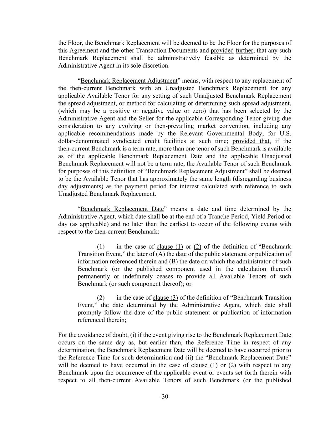 -30-下限,就本协议和其他交易文件而言,基准更换将被视为下限,并进一步规定,任何此类基准更换应在行政上可行,由行政代理人全权酌情决定。“基准替换调整”是指,就任何以未经调整的基准替换当时的基准以任何适用的可用期限进行任何设定的此类未经调整的基准替换价差调整,或计算或确定此类价差调整的方法,(可能是正值或负值或零)已由行政代理人和卖方在适当考虑任何演变中的或当时盛行的市场惯例(包括相关政府机构提出的任何适用建议)的适用的相应期限选择,对于当时以美元计价的银团信贷融资;但如果当时的基准为期限利率,截至适用的基准更换日,该基准有一个以上的期限可用,且适用的未调整基准更换期将不是期限利率,则就本定义“基准更换期调整”而言,该基准的可用期限应被视为与参照该未调整基准更换期计算的利息支付期限大致相同(不考虑营业日调整)的可用期限。“基准更换日”是指由行政代理人确定的日期和时间,该日期应在一个分档期、收益期或日(如适用)结束时,且不迟于与当时的基准相关的下列事件最早发生的日期:(1)在“基准转换事件”定义第(1)或(2)款的情况下,(a)公开声明或公布其中所指信息的日期和(b)该基准(或计算该基准时使用的已公布部分)的管理人永久或无限期停止提供该基准(或其此类部分)的所有可用期限的日期,两者中较后者;或(2)在“基准过渡事件”定义第(3)条的情况下,行政代理人确定的日期,该日期应紧随其中所指的公开声明或公布信息的日期;为免生疑问,(i)如导致基准更换日期的事件发生在与任何确定有关的参考时间的同一天,但早于该日期,基准更换日期将被视为发生在此种确定的参考时间之前,而(ii)在第(1)或(2)条有关任何基准的情况下,“基准更换日期”将被视为发生在其中所述的有关该基准的所有当时可用的期限的适用事件或事件发生时(或已公布的