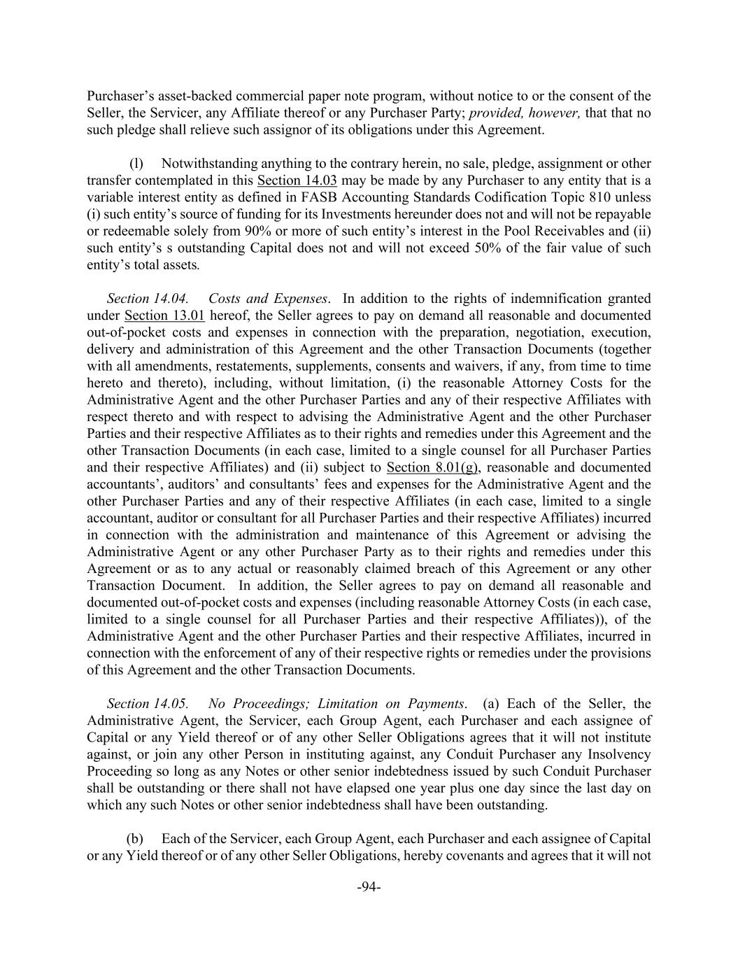 -94-买方的资产支持商业票据计划,未经通知或征得卖方、服务商、其任何关联公司或任何买方方的同意;但前提是,任何此类质押均不得解除该转让人在本协议下的义务。(l)尽管本文有任何相反的规定,任何买方不得向属于FASB会计准则编纂主题810中定义的可变利益实体的任何实体进行本条第14.03条所设想的任何出售、质押、转让或其他转让,除非(i)该实体根据本协议进行投资的资金来源没有也不会仅从该实体在集合应收款中的90%或更多权益中偿还或赎回,并且(ii)该实体的未偿资本不会也不会超过该实体总资产公允价值的50%。第14.04节。成本和开支。除根据本协议第13.01条授予的赔偿权利外,卖方同意按要求支付与本协议和其他交易文件的编制、谈判、执行、交付和管理有关的所有合理且有文件证明的自付费用和开支(连同所有修订、重述、补充、同意和放弃,如果有的话,不时与本协议及其相关),包括但不限于,(i)行政代理人和其他买方当事人及其各自的任何关联公司就其在本协议和其他交易文件下的权利和补救措施(在每种情况下,仅限于所有买方当事人及其各自的关联公司的单一律师)向行政代理人和其他买方当事人及其各自的关联公司提供咨询的合理律师费,以及(ii)在符合第8.01(g)条的规定下,合理且有文件证明的会计师’,行政代理人和其他买方当事人及其任何关联公司(在每种情况下,限于所有买方当事人及其各自关联公司的单一会计师、审计师或顾问)因管理和维护本协议或就行政代理人或任何其他买方当事人在本协议项下的权利和补救措施或任何实际或合理声称违反本协议或任何其他交易文件而产生的审计师和顾问费用和开支。此外,卖方同意按要求支付行政代理人和其他买方当事人及其各自关联人因强制执行本协议和其他交易文件规定的各自权利或补救办法而产生的所有合理且有文件证明的自付费用和开支(包括合理的律师费(在每种情况下,限于所有买方当事人及其各自关联人的单一律师))。第14.05节。没有诉讼程序;对付款的限制。(a)卖方、行政代理人、服务商、各集团代理人、各买方及资本或其任何收益或任何其他卖方义务的各受让人同意,其不会对任何管道买方提起或与任何其他人一起对任何管道买方提起任何破产程序,只要该管道买方发行的任何票据或其他优先债务尚未清偿,或自任何该等票据或其他优先债务尚未清偿的最后一天起不得超过一年加一天。(b)每名服务人、每名集团代理人、每名买方及每名资本或其任何收益或任何其他卖方义务的受让人,在此订立契约并同意其不