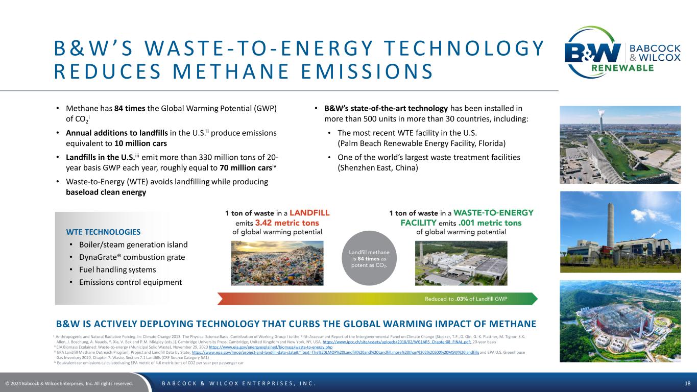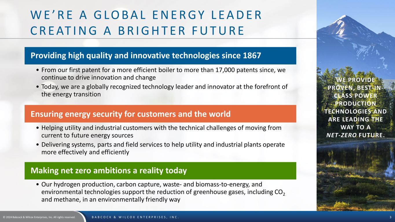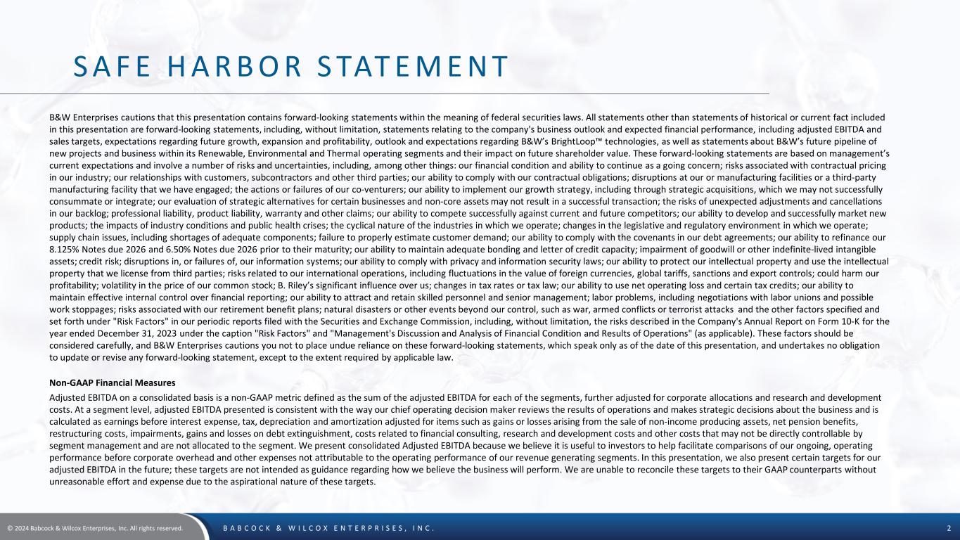 © 2024 Babcock & Wilcox Enterprises, Inc.版权所有。B A B C O C K & W I L C O X E N T E R P R I S E S,I N C. 2 S A F E H A R B O R S TAT E M E N T B & W Enterprises告诫说,本演示文稿包含联邦证券法含义内的前瞻性陈述。本演示文稿中包含的除历史或当前事实陈述之外的所有陈述均为前瞻性陈述,包括但不限于与公司业务前景和预期财务业绩相关的陈述,包括调整后的EBITDA和销售目标、对未来增长、扩张和盈利能力的预期、对B & W的BrightLoop ™技术的前景和预期,以及关于B & W未来在其可再生、环境和热力运营部门内的新项目和业务管道及其对未来股东价值的影响的陈述。这些前瞻性陈述基于管理层当前的预期,涉及许多风险和不确定性,其中包括:我们的财务状况和持续经营的能力;与我们行业的合同定价相关的风险;我们与客户、分包商和其他第三方的关系;我们遵守合同义务的能力;我们或我们所聘请的制造设施或第三方制造设施的中断;我们的合资企业的行为或失败;我们实施增长战略的能力,包括通过战略收购,我们可能无法成功完善或整合;我们对某些业务和非核心资产的战略替代方案的评估可能不会导致交易成功;我们积压订单中意外调整和取消的风险;职业责任、产品责任、保修和其他索赔;我们成功与当前和未来竞争对手竞争的能力;我们开发和成功营销新产品的能力;行业状况和公共卫生危机的影响;我们经营所在行业的周期性;我们经营所在的立法和监管环境的变化;供应链问题,包括足够组件的短缺;未能正确估计客户需求;我们遵守债务协议中的契约的能力;我们在2026年到期的8.125%票据和2026年到期的6.50%票据到期前再融资的能力;我们保持足够的担保和信用证能力的能力;商誉或其他无限期无形资产的减值;信用风险;中断或失败,我们的信息系统;我们遵守隐私和信息安全法律的能力;我们保护我们的知识产权和使用我们从第三方许可的知识产权的能力;与我们的国际业务相关的风险,包括外币价值波动、全球关税、制裁和出口管制;可能会损害我们的盈利能力;我们普通股价格的波动;B. Riley对我们的重大影响;税率或税法的变化;我们使用净经营亏损和某些税收抵免的能力;我们对财务报告保持有效内部控制的能力;我们吸引和留住技术人员和高级管理人员的能力;劳工问题,包括与工会的谈判和可能的停工;与我们的退休福利计划相关的风险;自然灾害或我们无法控制的其他事件,例如战争,武装冲突或恐怖袭击以及我们向美国证券交易委员会提交的定期报告中在“风险因素”项下具体说明和阐述的其他因素,包括但不限于公司截至2023年12月31日止年度的10-K表格年度报告中在“风险因素”和“管理层对财务状况和经营业绩的讨论和分析”(如适用)标题下描述的风险。应仔细考虑这些因素,B & W Enterprises提醒您不要过分依赖这些前瞻性陈述,这些陈述仅在本演示文稿发布之日起生效,并且不承担更新或修改任何前瞻性陈述的义务,除非适用法律要求。非GAAP财务指标合并基础上的调整后EBITDA是一种非GAAP指标,定义为每个部门的调整后EBITDA之和,并根据公司分配和研发成本进行进一步调整。在分部层面,所呈列的经调整EBITDA与我们的首席经营决策者审查经营业绩和就业务作出战略决策的方式一致,并计算为扣除利息费用、税项前的收益, 对出售非创收资产产生的损益、净养老金福利、重组成本、减值、债务清偿损益、与财务咨询相关的成本、研发成本以及分部管理层可能无法直接控制且未分配至分部的其他成本等项目进行调整的折旧和摊销。我们提出合并调整后EBITDA是因为我们认为,有助于促进比较我们的持续经营业绩、扣除公司管理费用和其他不属于我们创收部门经营业绩的费用之前的经营业绩,对投资者很有用。在本演示文稿中,我们还提出了未来调整后EBITDA的某些目标;这些目标并非旨在作为关于我们认为该业务将如何表现的指导。由于这些目标的理想性质,我们无法在没有不合理的努力和费用的情况下将这些目标与其GAAP对应方进行核对。