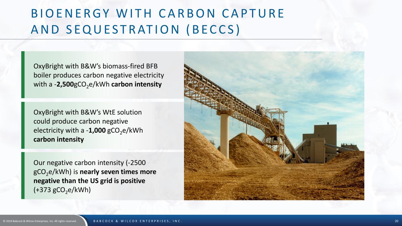 © 2024 Babcock & Wilcox Enterprises, Inc.版权所有。B A B C O C K & W I L C O X E N T E R P R I S E S,I N C. 20 B I O E N E R G Y W I T H C A R B O N C A P T U R E A N D S E Q U E S T R at I O N(B E C C S)OxyBright与B & W的生物质燃烧BFB锅炉产生碳负电,碳强度为-2,500gCO2e/kWh OxyBright与B & W的WTE解决方案可以产生碳负电,碳强度为-1,000gCO2e/kWh碳强度我们的负碳强度(-2500 gCO2e/kWh)是负电的近七倍比美国电网正(+ 373 gCO2e/kWh)