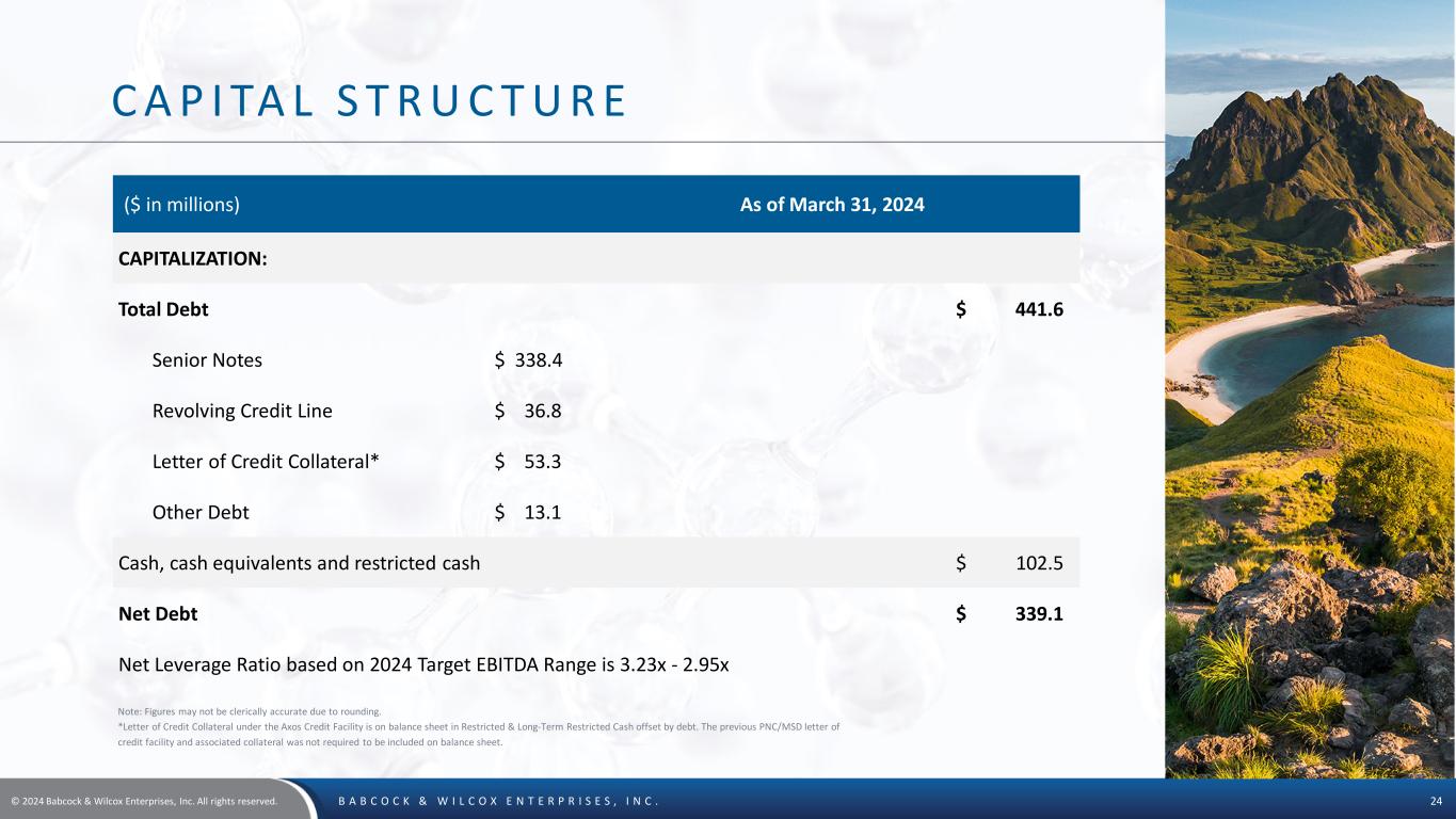 © 2024 Babcock & Wilcox Enterprises, Inc.版权所有。B A B C O C K & W I L C O X E N T E R P R I S E S,I N C. 22 C O N S O L I D at E D F I N A N C I A L S U M A R Y-C O N T I N U I N G O P E R at I O N S(百万美元)截至2024年3月31日的三个月截至3月31日的三个月,2023年收入207.6美元241.3美元毛利率48.5美元52.0美元销售、一般和管理费用41.4美元48.0美元营业收入4.3美元1.3美元目标EBITDA(1)1.05亿美元至1.15亿美元(1)如果没有不合理的努力,就无法获得最具可比性的GAAP目标。Target基于持续运营业务,不包括BrightLoop ™和ClimateBright ™费用