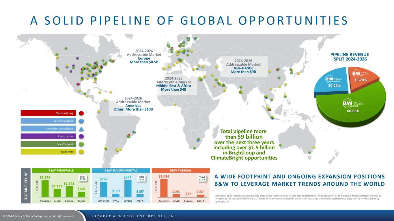 © 2024 Babcock & Wilcox Enterprises, Inc.版权所有。B A B C O C K & W I L C O X E N T E R P R I S E S,I N C. 8公司快照B A B C O C K & W I L C OX P R O F I L E注:所有图表均基于LTM 2024年3月31日的收入,除非另有说明。1.积压不包括交货期较短的零件和服务。2.没有不合理的努力,就无法获得最具可比性的GAAP目标。Target基于不包括BrightLoop ™和ClimateBright ™费用的持续运营业务。免责声明:B & W Enterprises告诫不要过分依赖任何前瞻性陈述,这些陈述仅在本演示文稿发布之日发表,可能会受到我们SEC报告中描述的风险的影响。我们不承担更新或修改任何前瞻性陈述的义务,除非适用法律要求。总部:Akron OH,USA Founded:1867年所有权:Public(NYSE:BW)员工:~2,200 LTM 2024年3月收入:~9.657亿美元2024年EBITDA目标:1.05亿美元至115M2美元B & W可再生能源发电68%工业32%售后市场&升级10%零部件和服务69%北美17%欧洲73%亚洲和其他10%新建21% B & W THERMAL Industrial 35%发电65%售后市场&升级46%零部件和服务42%北美87%欧洲2%亚洲和其他11%新建12% B & W Environmental Industrial 36%发电64%售后市场&升级30%零部件和服务28%北美33%欧洲31%新建42%亚洲和其他37%合并27% 22% 51% 30% 31% 39%工业34%发电66%售后市场&升级33%零部件和服务46%新建21%北美56%欧洲28%亚洲和其他16%积压1截至2024年3月31日B & W可再生能源LTM收入B & W环境B & W热