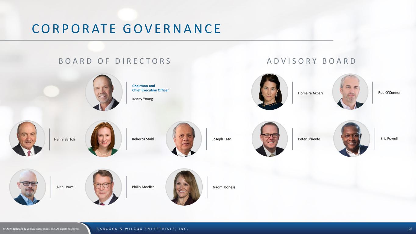 © 2024 Babcock & Wilcox Enterprises, Inc.版权所有。B A B C O C K & W I L C O X E N T E R P R I S E S,I N C. 26 Joseph Tato C O R P O R AT E G O V E R N A N C E Rebecca StahlHenry Bartoli B O A R D O F D I R E C T O R S Alan Howe Philip Moeller Peter O’Keefe Rod O’ConnorHomaira Akbari A D V I S O R Y B O A R D Eric Powell董事长兼首席执行官Kenny Young Naomi Boness