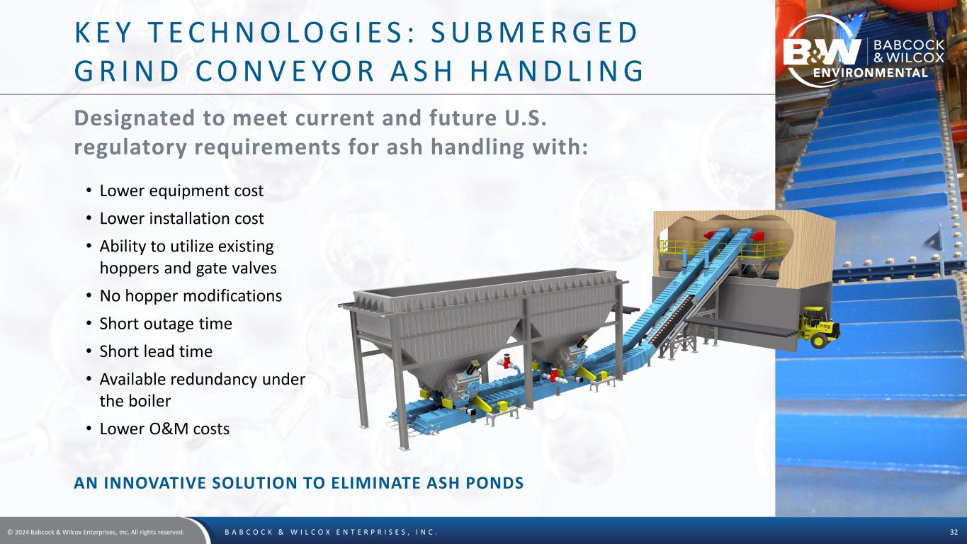 © 2024 Babcock & Wilcox Enterprises, Inc.版权所有。B A B C O C K & W I L C O X E N T E R P R I S E S,I N C. 31 K E Y T E C H N O L O G I E S:F L U E G A S T R E at M E N T F O R C A R B O N C A P T U R E •优化溶剂型洗涤技术上的碳捕集,要求减少进入烟气中发现的各种污染物•我们的解决方案包括酸性气体、微粒和酸雾、NOX、汞和烟气水分技术,这是燃烧后碳捕获的气体预处理技术的世界领先者