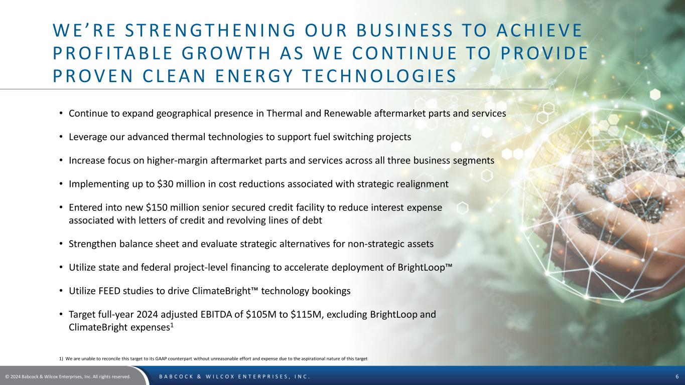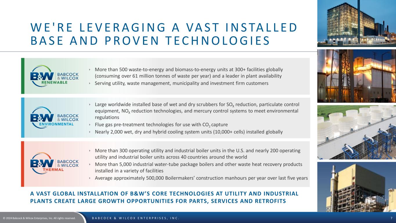 © 2024 Babcock & Wilcox Enterprises, Inc.版权所有。B A B C O C K & W I L C O X E N T E R P R I S E S,I N C. 6 •继续扩大在热和可再生售后市场零件和服务领域的地域存在•利用我们先进的热技术支持燃料转换项目•在所有三个业务部门中更多地关注利润率更高的售后市场零件和服务•实施与战略调整相关的高达3000万美元的成本削减•签订新的1.5亿美元高级担保信贷额度,以减少与信用证和循环债务额度相关的利息支出•加强资产负债表并评估非战略资产的战略替代方案•利用国家和联邦项目级融资,以加速BrightLoop ™的部署•利用FEED研究推动ClimateBright ™技术预订• 2024年全年调整后EBITDA目标为1.05亿美元至1.15亿美元,不包括BrightLoop和ClimateBright费用1WE ' R E T R E N G T H E N I N G O U R B US I N E S to A C H I E V E P R O F I TA B L E G R O W H A S W E C O N T I N U E to P R O V I D E P R O V E N C L EA N E N E R GY T EC H N O L G I E S1)由于该目标的理想性质,我们无法在没有不合理的努力和费用的情况下将该目标与其GAAP对应对象进行核对