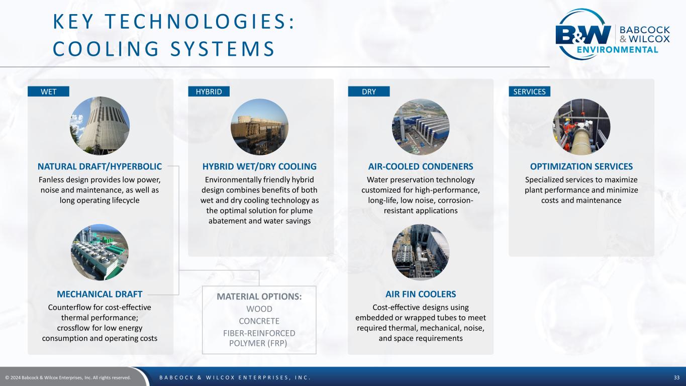 © 2024 Babcock & Wilcox Enterprises, Inc.版权所有。B A B C O C K & W I L C O X E N T E R P R I S E S,I N C. 33 K E Y T E C H N O L O G I E S:C O O L I N G S natural draft/hyperBOLIC无风扇设计提供低功率、噪音和维护,以及长操作生命周期的机械草图逆流,以实现具有成本效益的热性能;低能耗和运营成本的横流AIR-COOLED CODENERS为高性能、长寿命、低噪音、耐腐蚀应用定制的保水技术空气翅片冷却器采用嵌入式或包裹管的高性价比设计,以满足所需的热、机械、噪音,和空间要求HYBRID湿/干冷却环保混合设计结合了干湿冷却技术的优点,作为羽流消减和节水材料选项的最佳解决方案:WOD混凝土纤维增强聚合物(FRP)优化服务专业服务,以最大限度地提高工厂性能并最大限度地降低成本和维护干HYBRIDWET服务