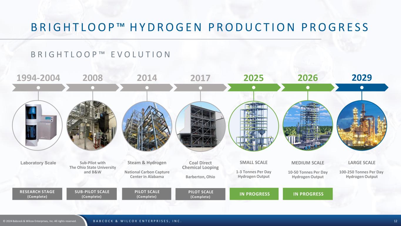© 2024 Babcock & Wilcox Enterprises, Inc.版权所有。B A B C O C K & W I L C O X E N T E R P R I S E S,I N C. 11 B R I G H T L O O P ™ H Y D R O G E N P R O D U C T I O N Significant advantages:•来自固体燃料的氢–可以利用多种固体或气体燃料作为原料•高碳捕获率–固有的CO2隔离支持隔离或利用,而无需昂贵的燃烧后捕获设备和运行•具有竞争力的氢气成本–与其他制氢方法相比,氢气的平准化成本更低•高质量的氢气–与从燃料中分离氢气相比,利用蒸汽生产的氢气产生更高的质量•可扩展用于一系列应用–可容纳大型和小型应用BIOMASS FEEDStock Options Output optionSNitrogen for Beneficial Use BIOGAS COAL Natural Gas Steam Syngas Hydrogen Electricity Petroleum COKE CO2 for Storage/Beneficial Use BrightLoop ™技术