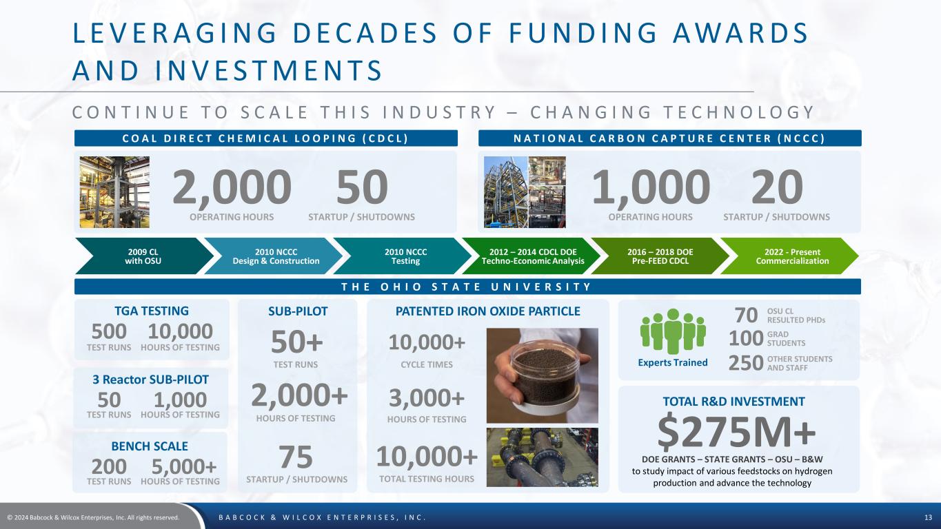 © 2024 Babcock & Wilcox Enterprises, Inc.版权所有。B A B C O C K & W I L C O X E N T E R P R I S E S,I N C. 12 B R I G H T L O O P ™ H Y D R O G E N P R O D U C T I O N P R O G R E S B R I G H L O P ™ E V O L U T I O N Sub-Pilot with the Ohio State University和B & W中型规模10-50吨/日氢气产出大规模100-250吨/日氢气产出子试点规模(完整)20082026年2029年进展实验室规模研究阶段(完整)1994-2004年试点规模(完整)阿拉巴马州蒸汽和氢气国家碳捕集中心2014年小规模规模1-3吨/日氢气产出进展2025年试点规模(完整)煤直接化学Looping Barberton,Ohio 2017