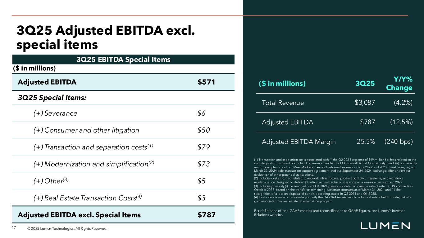 ©2025年Lumen Technologies。版权所有。2非GAAP衡量标准本演示文稿包括某些历史和前瞻性非GAAP财务衡量标准,包括但不限于调整后EBITDA、调整后EBITDA利润率和自由现金流,每一项都排除了特殊项目的影响,以及对GAAP和其他非GAAP衡量标准的调整,以排除特殊项目的影响。除了为管理层评估公司业绩提供关键指标外,我们认为这些衡量有助于投资者了解不同时期的经营业绩,并确定历史和预期趋势。非GAAP财务指标与最具可比性的GAAP指标的对账包含在公司随附的收益发布的财务时间表中。电话会议期间可能讨论的信息和其他非GAAP历史财务指标的核对,以及非GAAP财务指标的进一步描述,将在公司网站http://ir.lumen.com的投资者关系部分提供。非GAAP措施不是作为GAAP措施的替代或替代,敦促投资者在根据GAAP编制的措施之外考虑这些非GAAP措施,而不是作为替代措施。Lumen提出或计算其非GAAP衡量标准可能与其他公司不同。