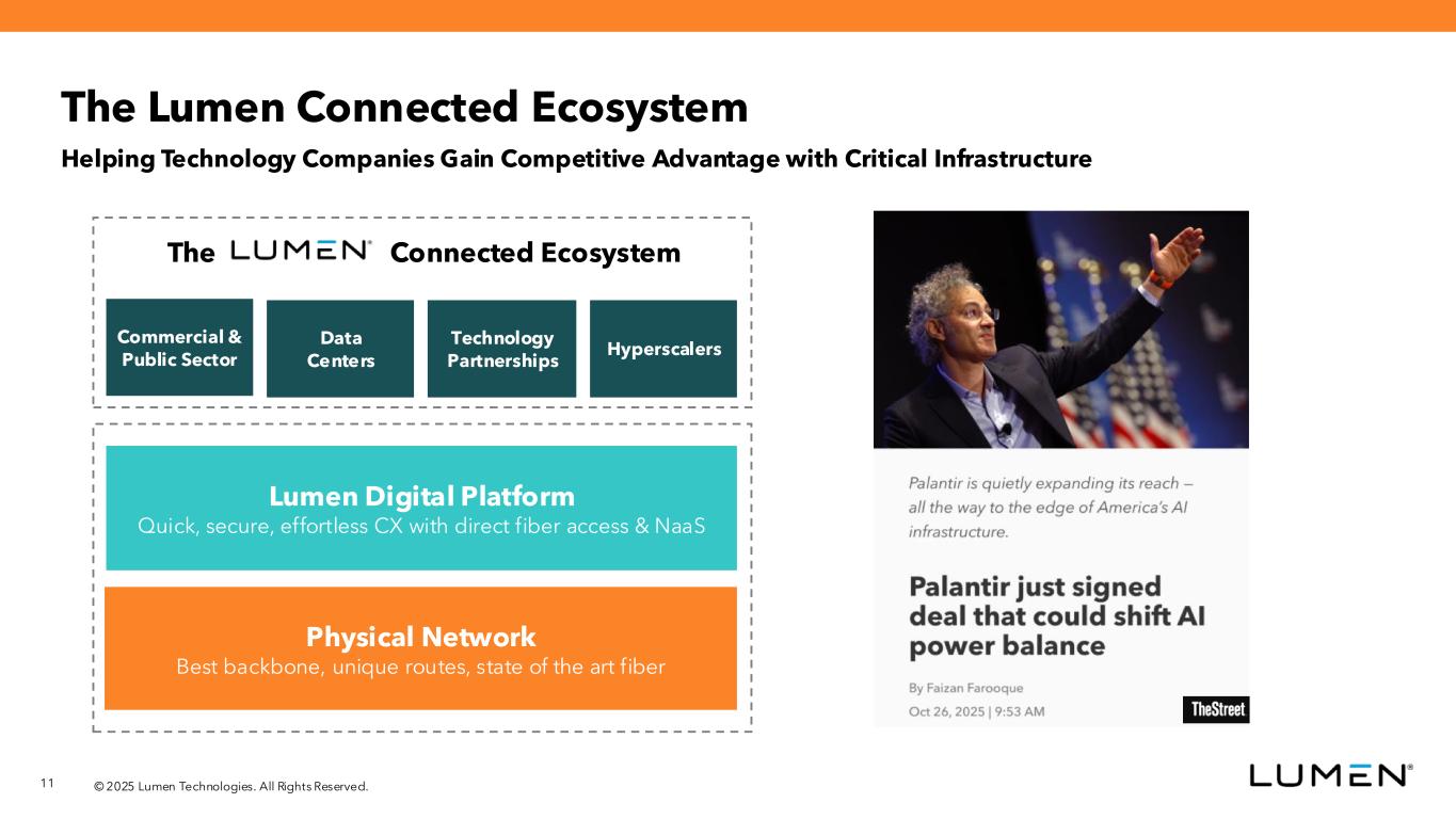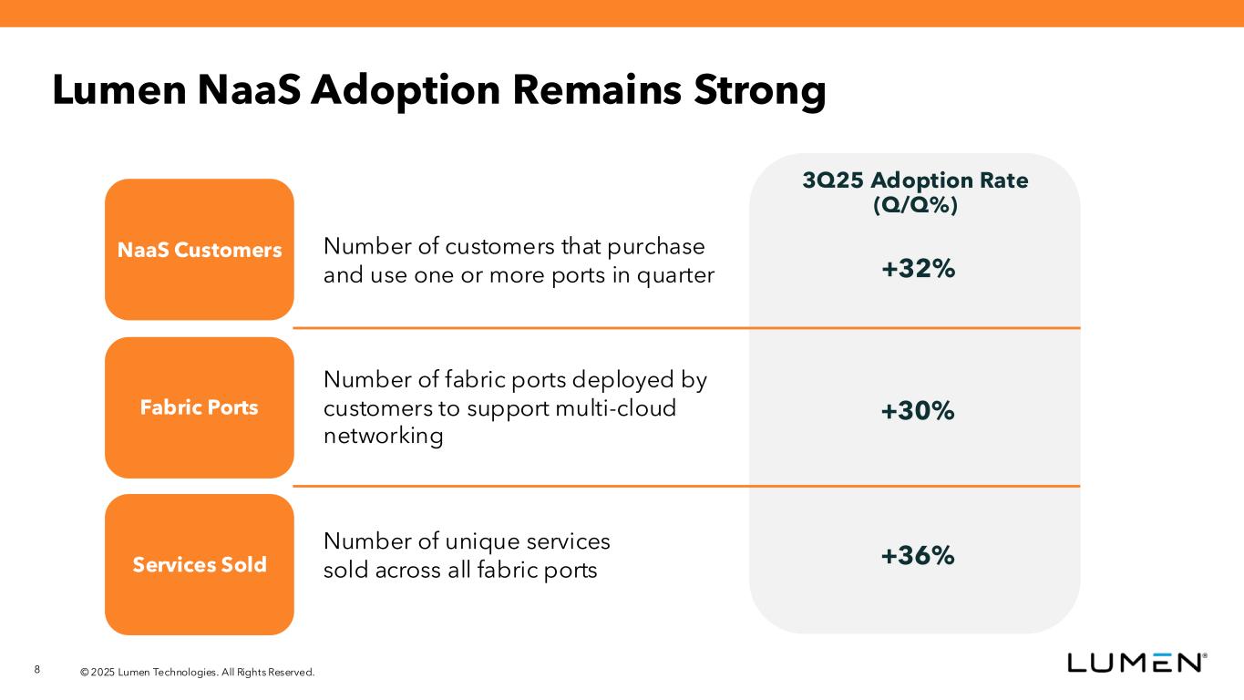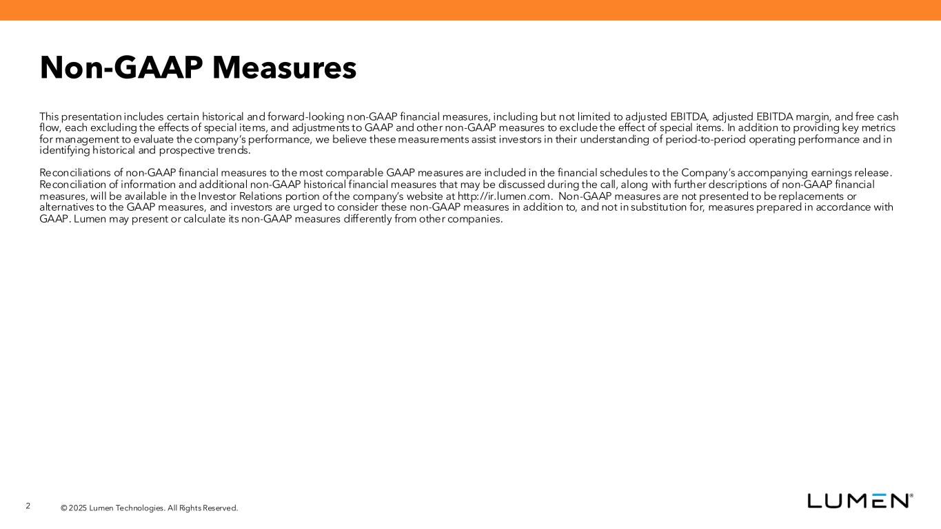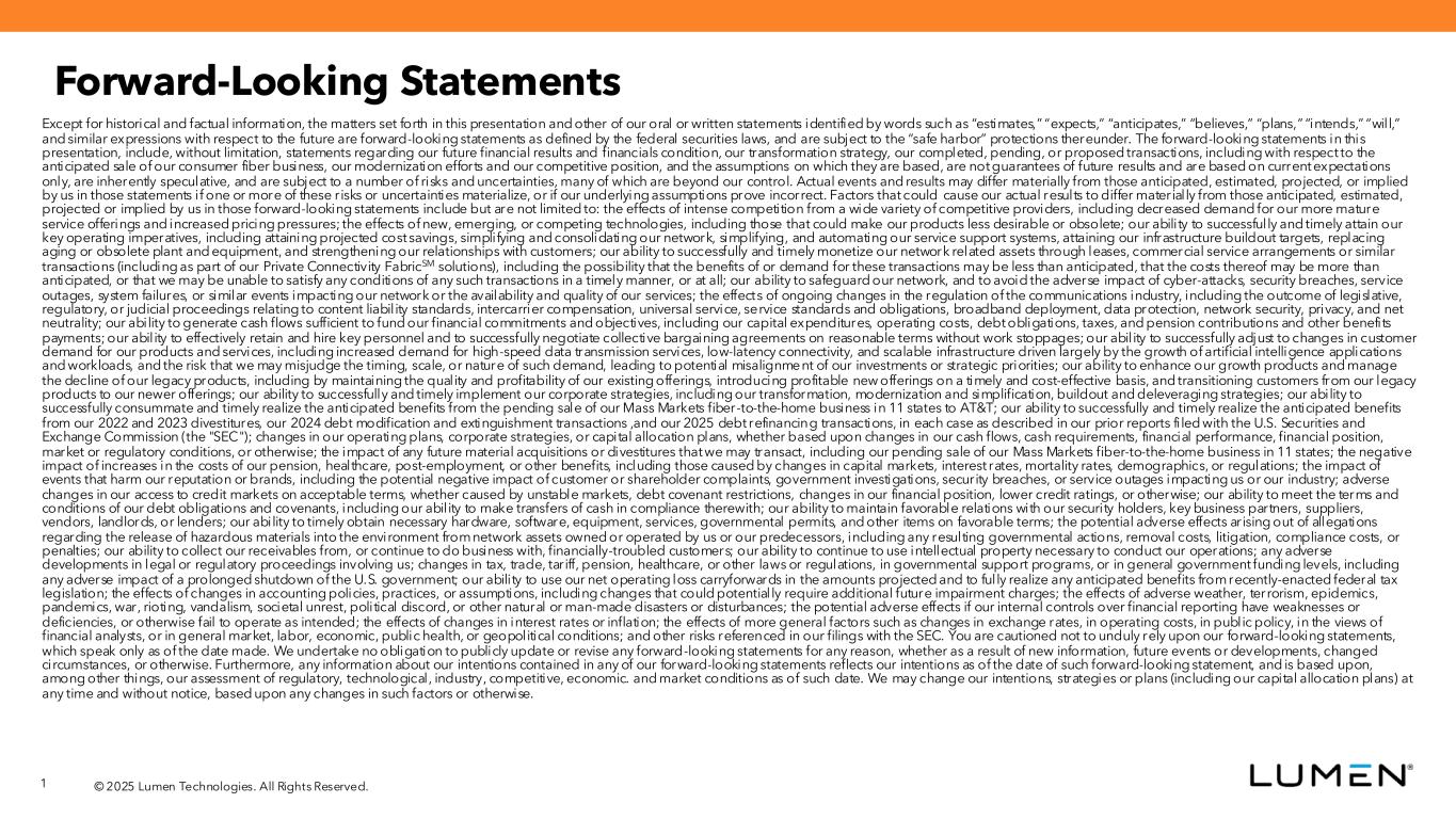 ©2025年Lumen Technologies。版权所有。1前瞻性陈述除历史和事实信息外,本演示文稿中阐述的事项以及我们以“估计”、“预期”、“预期”、“相信”、“计划”、“打算”、“将”等词语标识的其他口头或书面陈述以及与未来相关的类似表述均为联邦证券法定义的前瞻性陈述,并受其下的“安全港”保护。本演示文稿中的前瞻性陈述包括但不限于关于我们未来财务业绩和财务状况、我们的转型战略、我们已完成、待完成或拟议的交易的陈述,包括关于我们消费纤维业务的预期出售、我们的现代化努力和我们的竞争地位,以及它们所基于的假设,这些陈述不是对未来结果的保证,仅基于当前的预期,本质上是推测性的,并受到许多风险和不确定性的影响,其中许多是我们无法控制的。如果这些风险或不确定性中的一项或多项成为现实,或者如果我们的基本假设被证明不正确,实际事件和结果可能与我们在这些陈述中的预期、估计、预测或暗示的存在重大差异。可能导致我们的实际结果与我们在这些前瞻性陈述中预期、估计、预测或暗示的结果存在重大差异的因素包括但不限于:来自各种竞争性供应商的激烈竞争的影响,包括对我们更成熟的服务产品的需求减少和定价压力增加;新技术、新兴技术或竞争性技术的影响,包括那些可能使我们的产品不那么受欢迎或过时的技术;我们成功和及时实现关键运营需求的能力,包括实现预计的成本节约、简化和巩固我们的网络、简化,和自动化我们的服务支持系统,实现我们的基础设施建设目标,更换老化或过时的厂房和设备,并加强我们与客户的关系;我们通过租赁、商业服务安排或类似交易(包括作为我们的Private Connectivity FabricSM解决方案的一部分)成功和及时地将我们的网络相关资产货币化的能力,包括这些交易的收益或需求可能低于预期,其成本可能高于预期,或者我们可能无法及时满足任何此类交易的任何条件,或根本没有;我们保护网络的能力,以及避免网络攻击、安全漏洞、服务中断、系统故障或影响我们网络或我们服务的可用性和质量的类似事件的不利影响的能力;通信行业监管持续变化的影响,包括与内容责任标准、运营商间补偿、普遍服务、服务标准和义务、宽带部署、数据保护、网络安全、隐私和网络中立性相关的立法、监管或司法程序的结果;我们产生足以为我们的财务承诺和目标(包括我们的资本支出)提供资金的现金流的能力,运营成本、债务义务、税收、养老金缴款和其他福利支付;我们有效保留和雇用关键人员的能力,以及在不停工的情况下以合理条款成功谈判集体谈判协议的能力;我们成功调整以适应客户对我们的产品和服务的需求变化的能力,包括主要由人工智能应用程序和工作负载的增长驱动的对高速数据传输服务、低延迟连接和可扩展基础设施的需求增加,以及我们可能错误判断此类需求的时间、规模或性质的风险,导致我们的投资或战略优先事项的潜在错位;我们增强增长产品和管理传统产品下滑的能力,包括保持现有产品的质量和盈利能力,及时和具有成本效益地推出有利可图的新产品,以及将客户从我们的传统产品过渡到我们的新产品;我们成功和及时实施公司战略的能力,包括我们的转型、现代化和简化,建设和去杠杆化战略;我们成功完善并及时实现将我们在11个州的Mass Markets光纤到户业务未决出售给美国电话电报所带来的预期收益的能力;我们成功及时实现2022年和2023年资产剥离所带来的预期收益的能力, 我们的2024年债务修改和清偿交易,以及我们的2025年债务再融资交易,在每种情况下,如我们与美国证券交易委员会(“SEC”)牵头的先前报告中所述;我们的运营计划、公司战略或资本分配计划的变化,无论是基于我们的现金流、现金需求、财务业绩、财务状况、市场或监管条件的变化,还是其他;我们可能进行的任何未来重大收购或资产剥离的影响,包括我们即将在11个州出售我们的大众市场光纤到户业务;我们的养老金、医疗保健、离职后或其他福利成本增加的负面影响,包括资本市场、利率、死亡率、人口统计或法规变化造成的负面影响;损害我们的声誉或品牌的事件的影响,包括客户或股东投诉、政府调查、安全漏洞或影响我们或我们行业的服务中断的潜在负面影响;我们以可接受的条件进入信贷市场的不利变化,无论是由不稳定的市场、债务契约限制造成的,我们的财务状况发生变化、信用评级降低或其他情况;我们满足债务义务和契约的条款和条件的能力,包括我们按照这些条款进行现金转移的能力;我们与证券持有人、主要业务合作伙伴、供应商、供应商、房东或贷方保持有利关系的能力;我们以优惠条件及时获得必要的硬件、软件、设备、服务、政府许可和其他物品的能力;有关我们或我们的前任拥有或经营的网络资产向环境中释放有害物质的指控所产生的潜在不利影响,包括任何由此产生的政府行为、搬迁成本、诉讼、合规成本或处罚;我们从陷入财务困境的客户那里收取应收款或继续与其开展业务的能力;我们继续使用开展业务所必需的知识产权的能力;涉及我们的法律或监管程序的任何不利发展;税收、贸易、关税、养老金、医疗保健或其他法律或法规、政府支持计划或一般政府资助水平的变化,包括美国政府长期停摆的任何不利影响;我们以预计金额