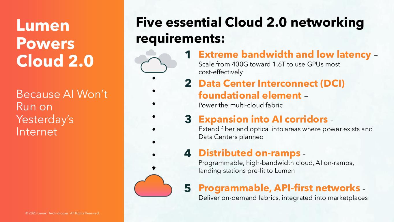 数据中心互连(DCI)基础元素–为多云结构提供动力,极高带宽和低延时–从400G扩展到1.6T,以使用GPU最经济有效的可编程、API优先网络–交付按需结构,融入市场扩展到AI走廊–将光纤和光纤扩展到存在电力和数据中心计划分布式入口匝道的区域–可编程、高带宽云、AI入口匝道、预点亮Lumen Lumen Powers Cloud 2.0的着陆站,因为AI不会在昨天的互联网上运行12345©2025年Lumen Technologies。版权所有。五大必备Cloud 2.0组网需求: