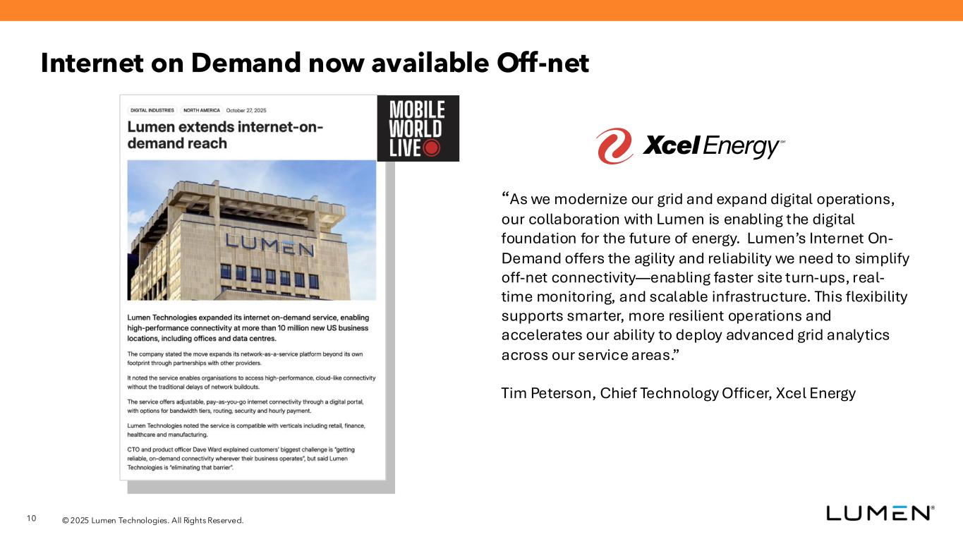 ©2025 Lumen Technologies。版权所有。10 Internet on Demand现已在网外提供“随着我们对电网进行现代化改造并扩大数字化运营,我们与Lumen的合作正在为能源的未来奠定数字化基础。Lumen的Internet On-Demand提供了我们简化网外连接所需的敏捷性和可靠性——实现更快的站点启动、实时监控和可扩展的基础设施。这种灵活性支持更智能、更有弹性的运营,并加速我们在整个服务领域部署高级网格分析的能力。”Tim Peterson,埃克西尔能源首席技术官